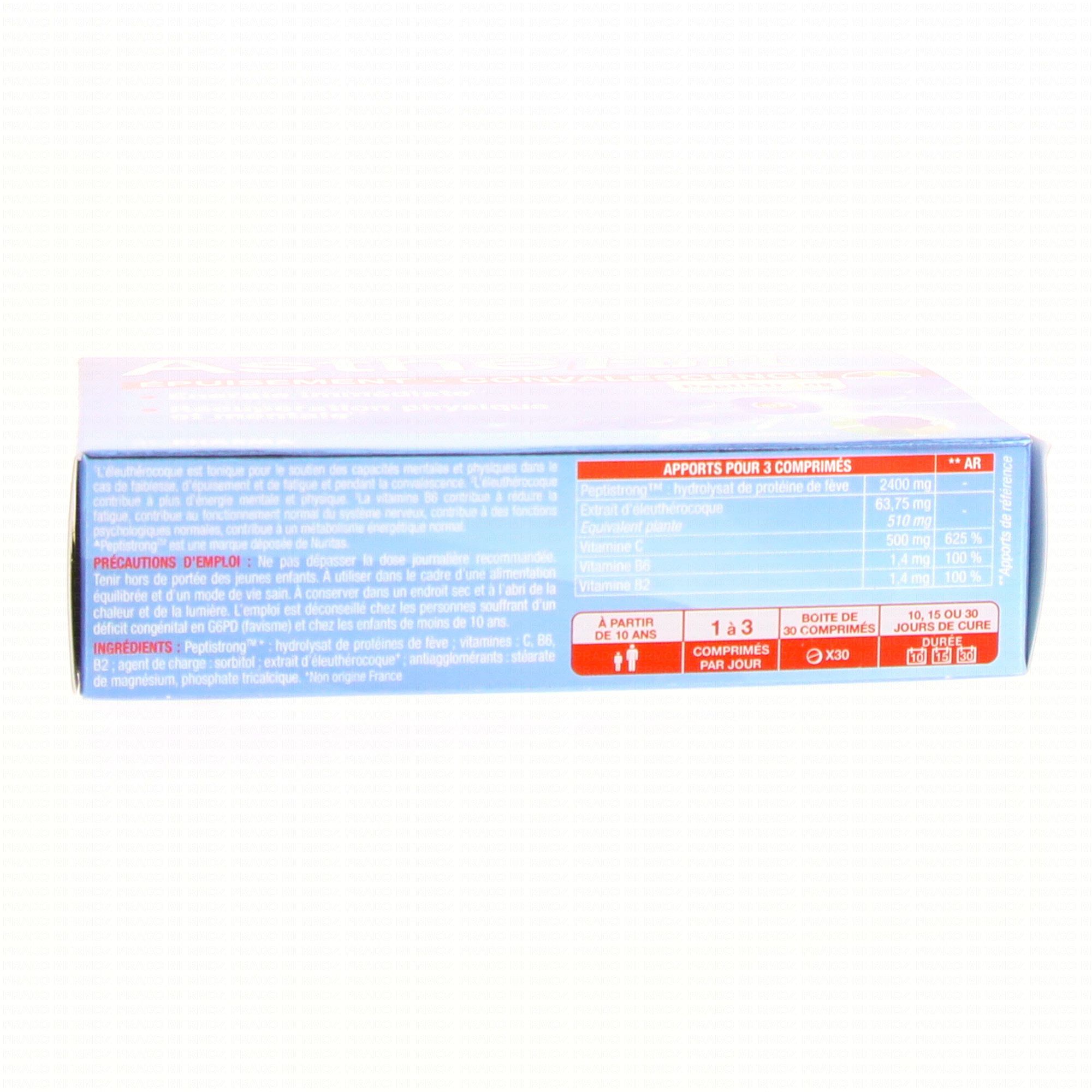 Peptistrong™ : Hydrolysat de protéines de fève, Vitamines : C, B6, B2 ; Agent de charge : Sorbitol, Extrait d'éleuthérocoque, Antiagglomérants : Stéarate de magnésium, Phosphate tricalcique.
