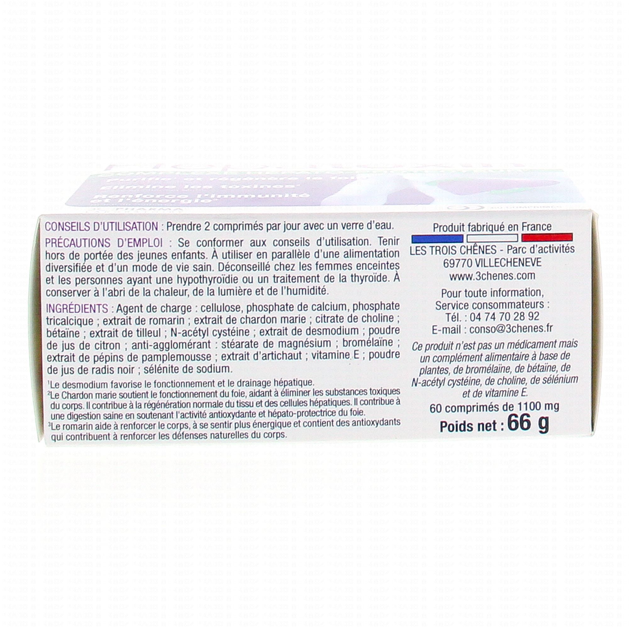 Tilleul, Artichaut, Bétaïne, Bromelaïne, Chardon marie, Choline, Pamplemousse, Radis noir, Romarin, Vitamine E, Sélénium, Desmodium