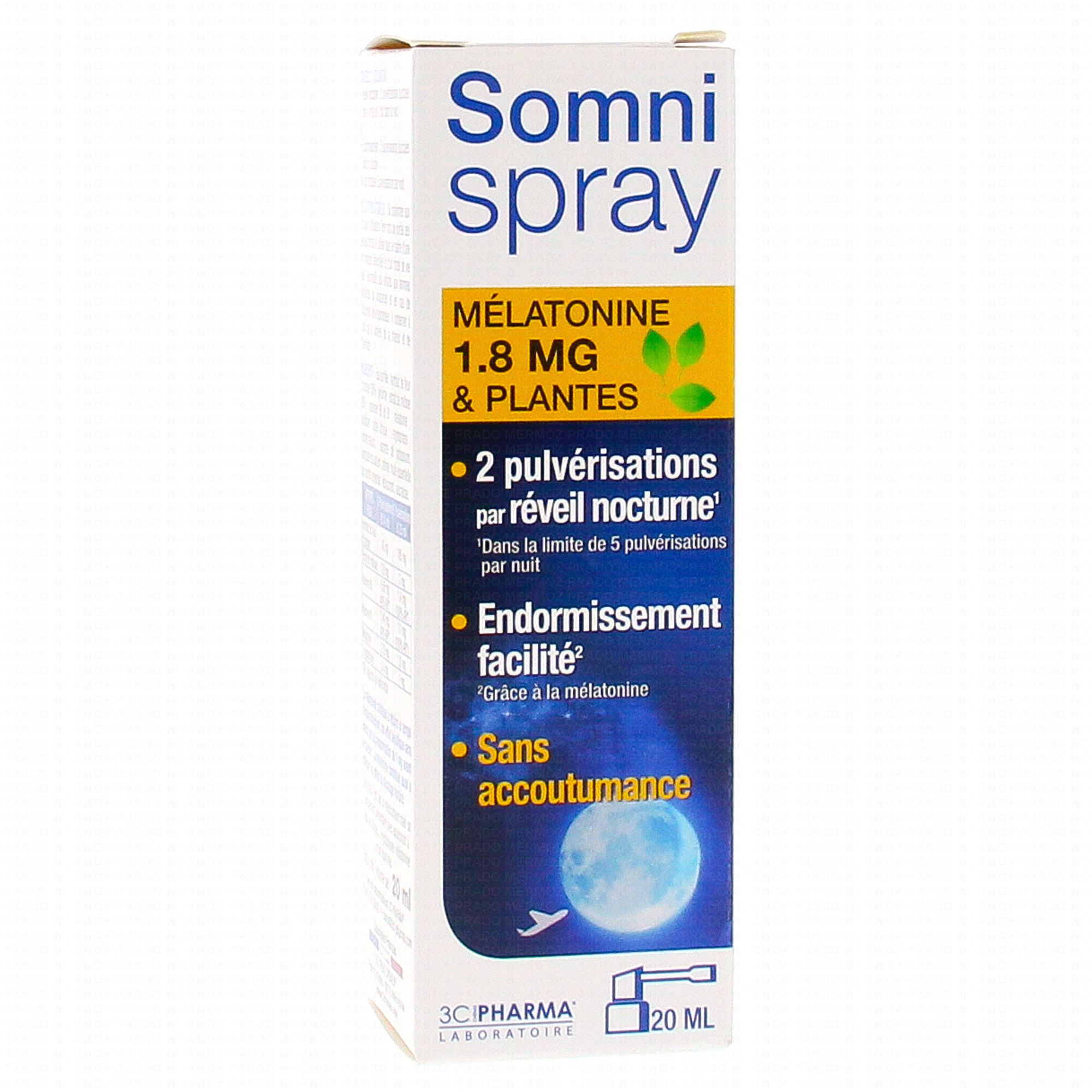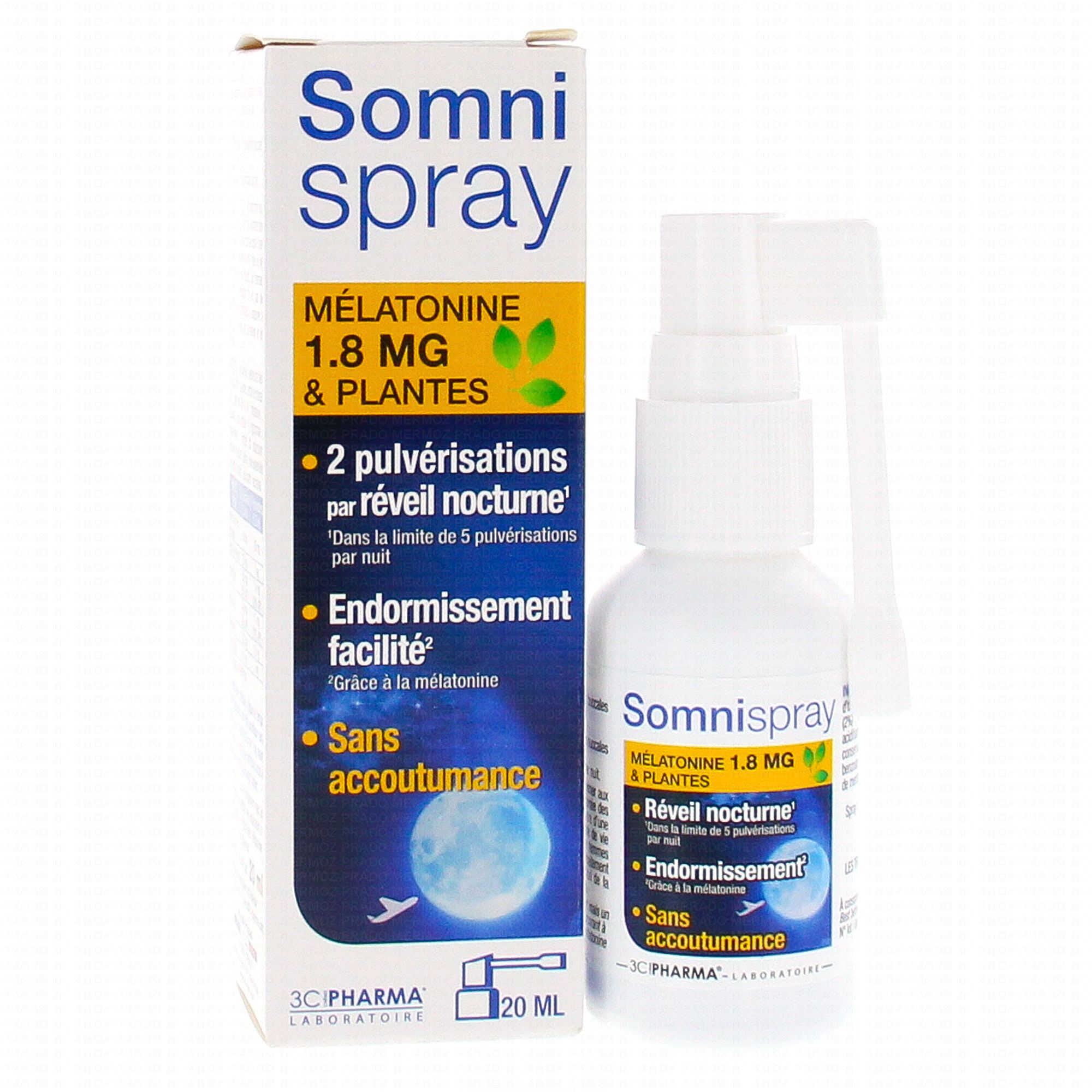 3C PHARMA SomniSpray 20 ml est un complément alimentaire à la mélatonine et au tryptophane, pour aider à réduire le temps d'endormissement