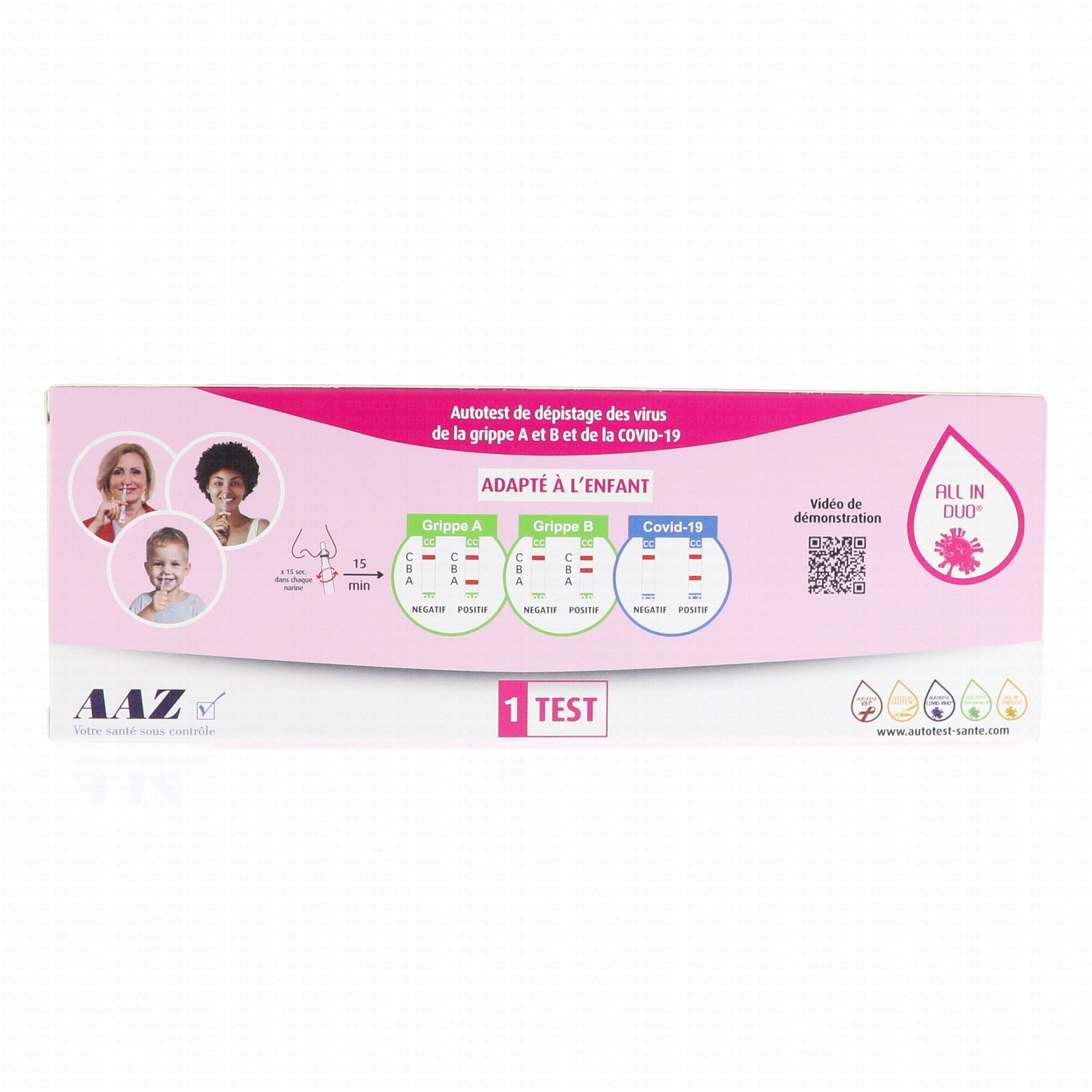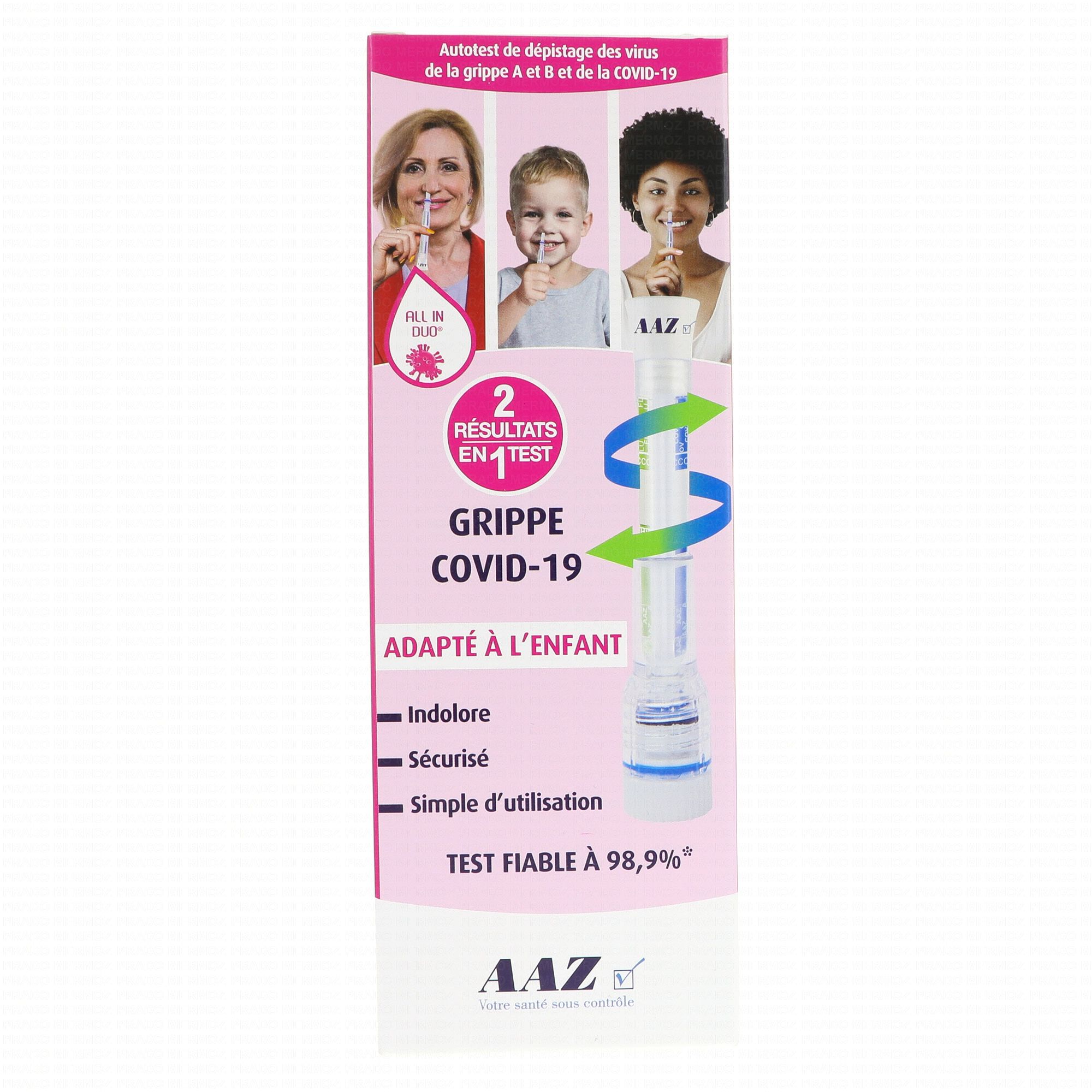 Ce test est désormais disponible en tant qu'autotest grippes A/B et COVID-19, à partir d'un prélèvement nasal, conçu pour l'enfant et adapté à l'adulte.