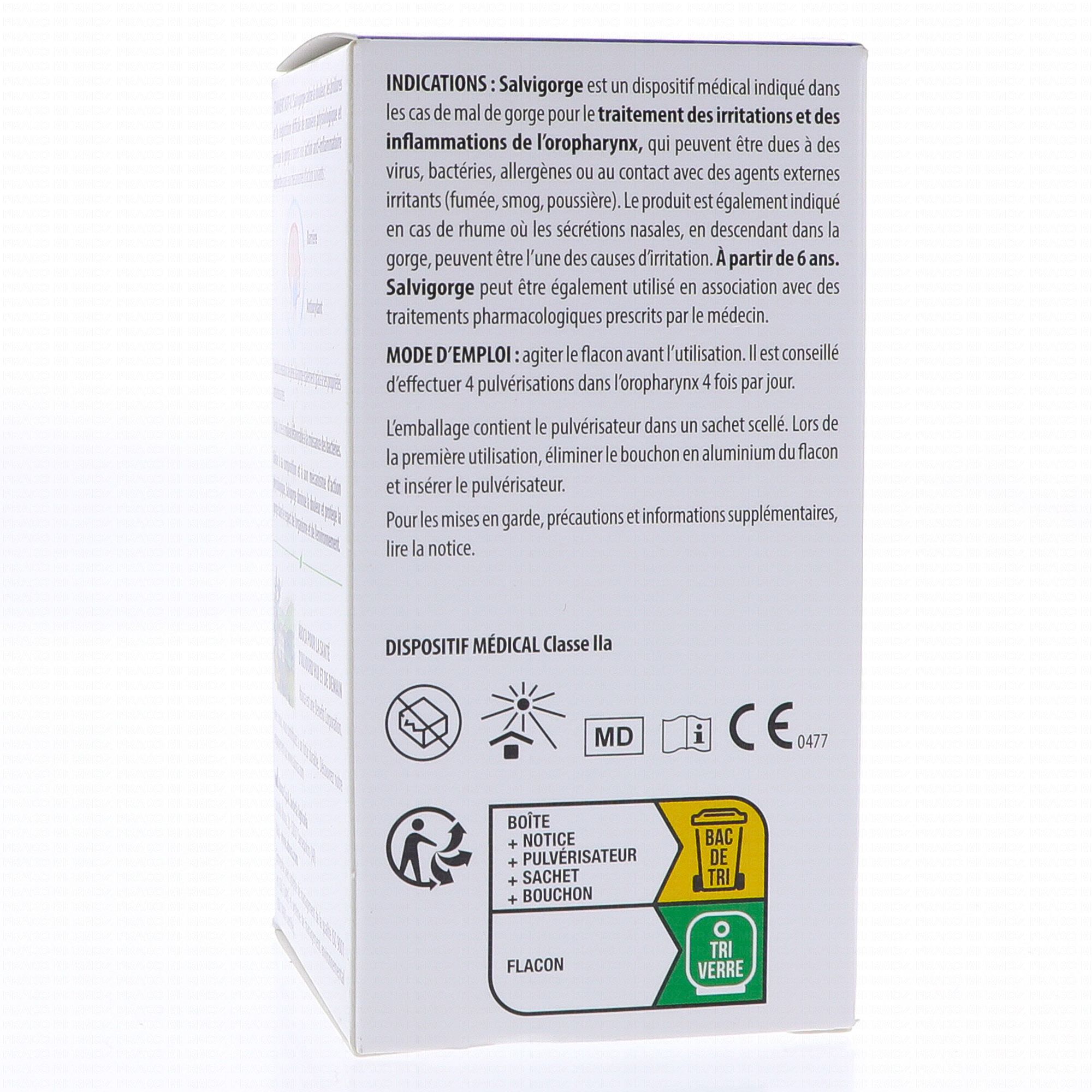 Maux de gorge. Salvigorge Spray peut être également pris pendant des périodes prolongées. Toutefois, si les symptômes ne disparaissent pas, il est également recommandé de consulter un médecin ou un pharmacien. Ne pas utiliser le produit en cas d'hypersensibilité ou d'allergie individuelle envers un ou plusieurs des composants. Lire la notice pour plus d'informations.
