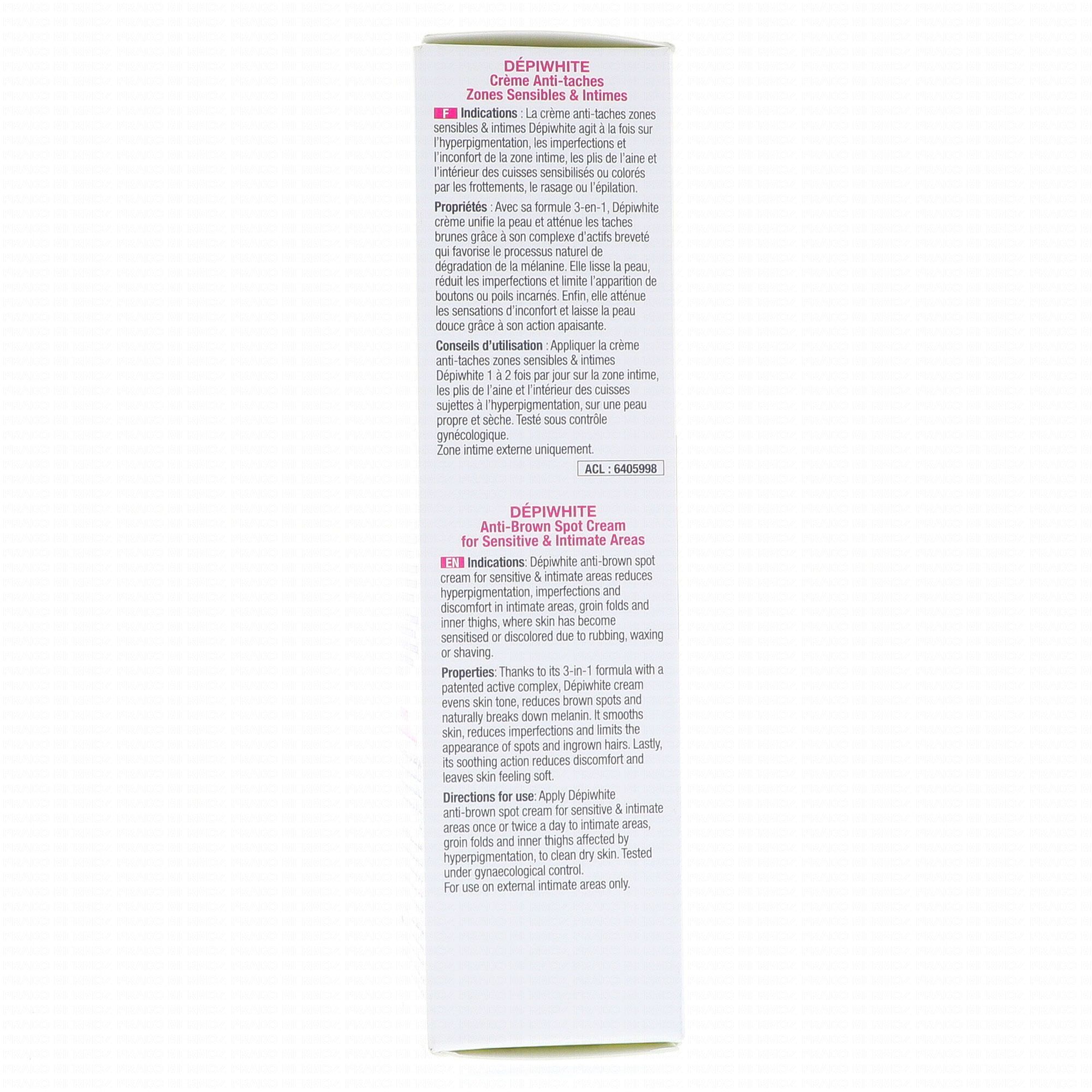 La crème anti-taches zones sensibles et intimes ACM Dépiwhite agit à la fois sur l'hyperpigmentation, les imperfections et l'inconfort de la zone intime, les plis de l'aine et l'intérieur des cuisses sensibilisé ou coloré par les frottements, le rasage ou l'épilation. Elle contribue ainsi à unifier la peau et permet de limiter l'apparition de boutons ou de poils incarnés. L'efficacité de cette crème anti-taches corps est cliniquement prouvée sur les peaux sujettes aux taches brunes.