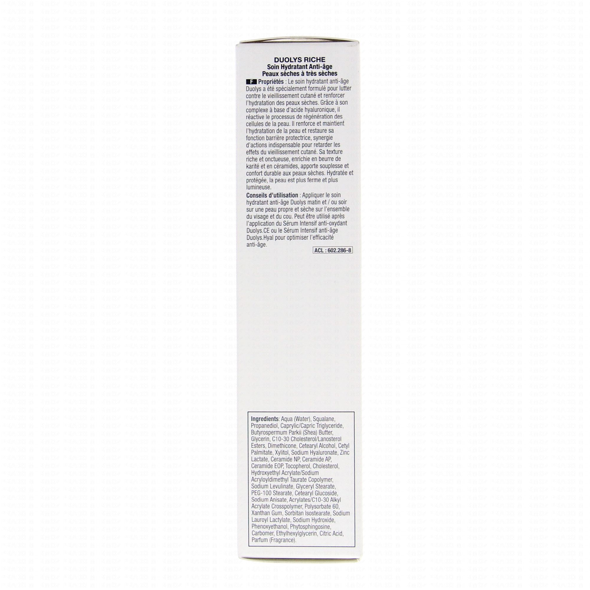 La déshydratation est une cause importante du vieillissement de la peau, notamment des peaux sèches qui ont tendance à se rider plus vite. Grâce à Duolys riche la peau retrouve son taux d'hydratation idéale, ce qui la rend plus ferme, plus lumineuse et plus douce. Il s'agit d'une émulsion à cristaux liquides qui favorise une meilleure pénétration des actifs hydratants.