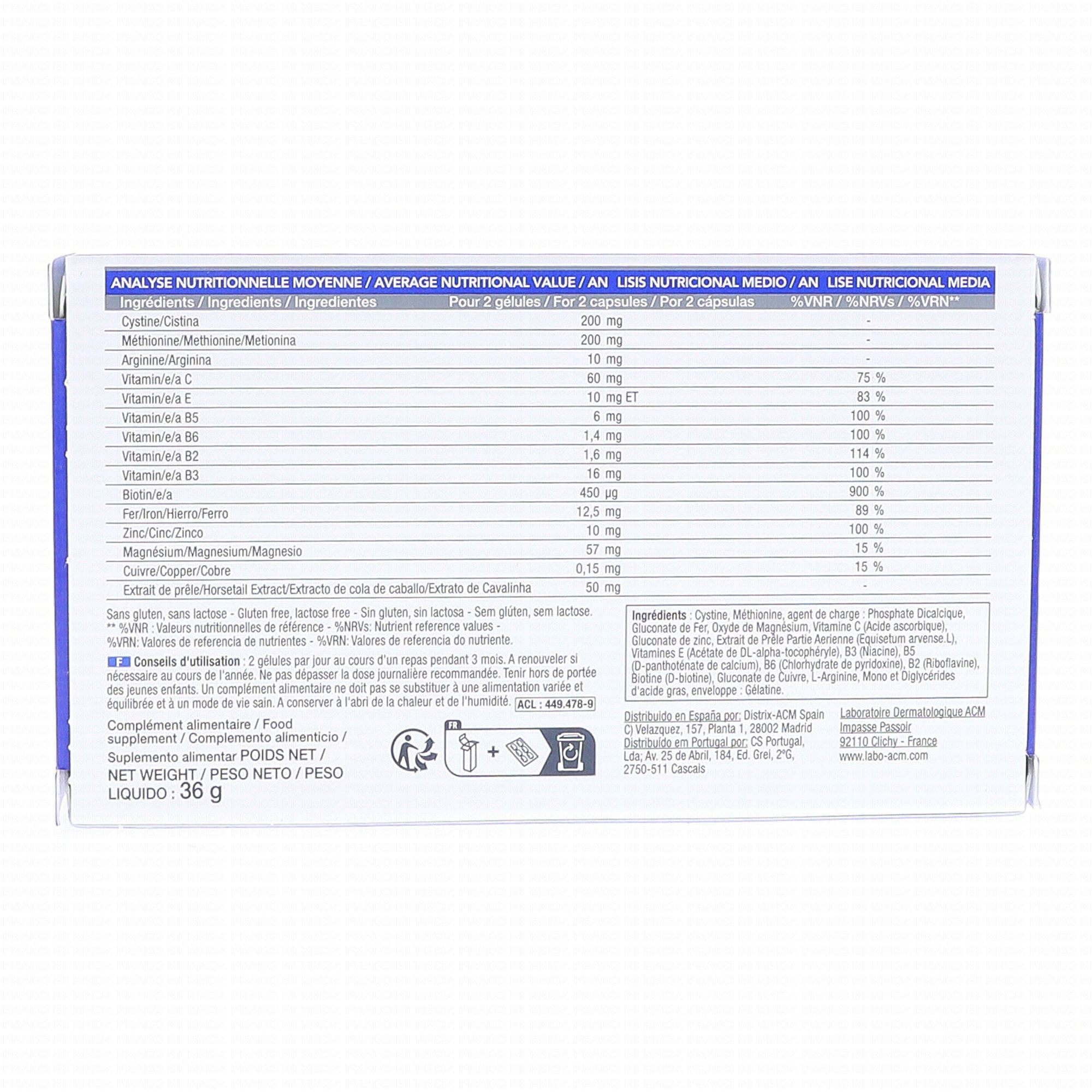 Ingrédients : Cystine, Méthionine, Agent de charge : Phopshate dicalcique, Gluconate de fer, Oxyde de magnésium, Vitamine C (Acide ascorbique), Gluconate de zinc, Extrait de prêle partie aérienne (Equiseum arvense L.), Vitamines E (Acétate de DL-alpha-tocophéryle), B3 (Niacine), B5 (D-panthoténate de calcium), B6 (Chlorhydrate de pyridoxine), B2 (Riboflavine), Biotine (D-Biotine), Gluconate de cuivre, L-arginine, Mono et Diglycérides d'acides gras, Enveloppe : Gélatine.