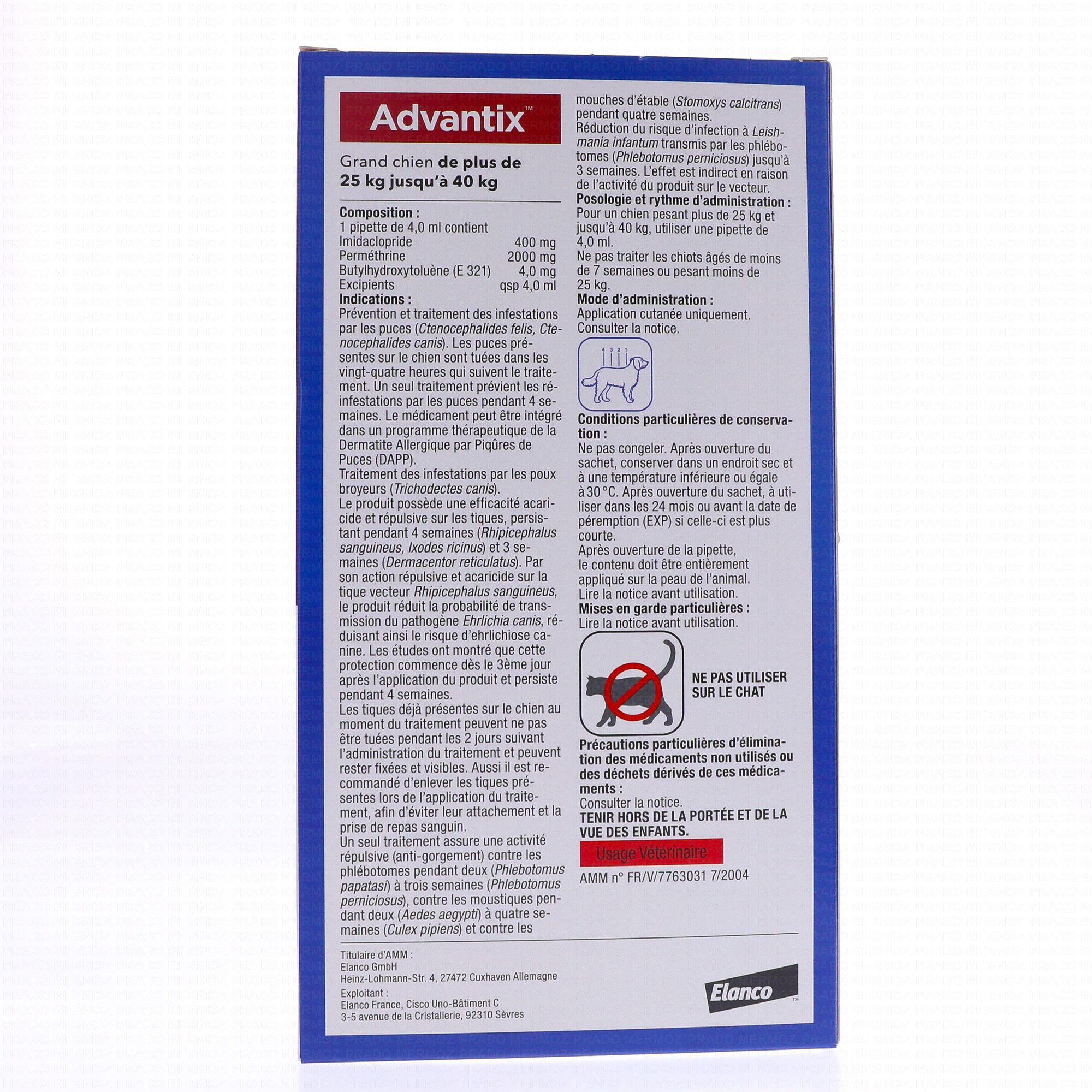 Prévient et traite les chiens entre 25 kg et 40 kg contre : les puces (Ctenocephalides felis, Ctenocephalides canis), durée d'efficacité 4 semaines. Les tiques (Rhipicephalus sanguineus, ixodes ricinus), durée d'efficacité 4 semaines et (Dermacentor reticulatus), durée d'efficacité 3 semaines. Les phlébotomes, les moustiques et les mouches d'étable (Phlebotomus papatasi), durée d'efficacité 2 semaines, (Phlebotomus perniciosus), durée d'efficacité 3 semaines, (Aedes aegypti), durée d'efficacité 2 semaines, (Culex pipiens et Stomoxys calcitrans), durée d'efficacité 4 semaines. Médicament pouvant être intégré dans un programme thérapeutique contre la Dermatite Allergique aux Piqûres de Puces (DAPP). Ne pas administrer aux chats, aux chiots de moins de 7 semaines et aux chiens de moins de 1,5 kg. Allergie à l'un des composants. Ne pas manger, ne pas boire, ne pas fumer pendant l'utilisation. Se laver les mains après chaque utilisation. Tenir hors de portée des enfants.
