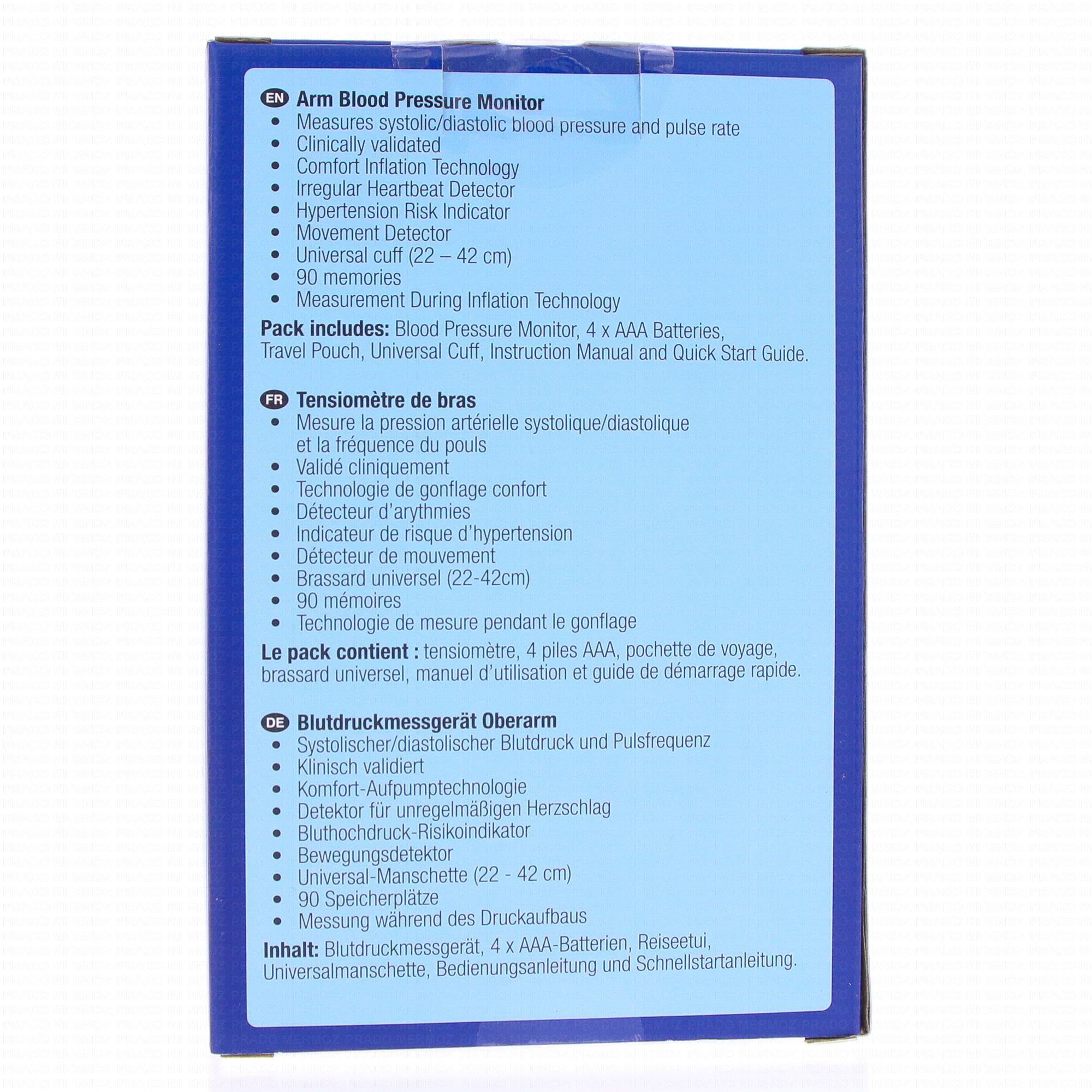 Ce pack contient : un tensiomètre, 4 piles AAA, une pochette de voyage, un brassard universel, un manuel d'utilisation et guide de démarrage rapide.