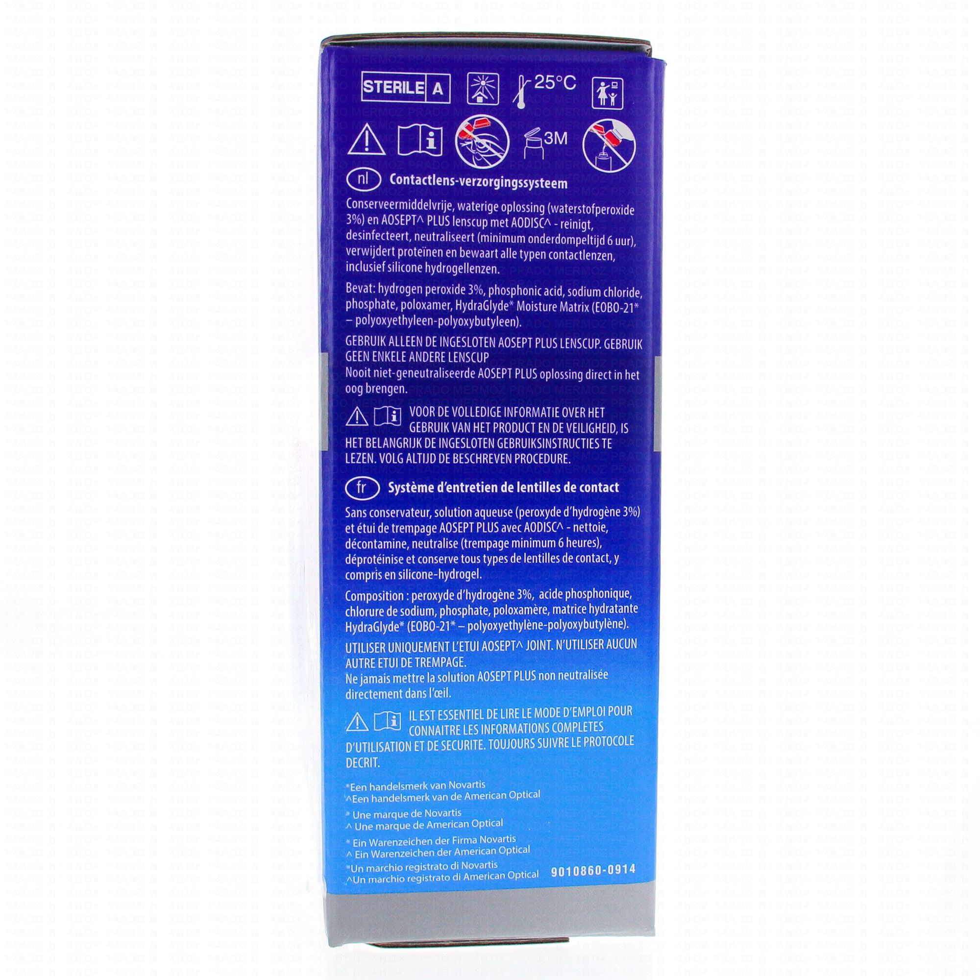 Hydraglyle de Aosept + est un oxydant pour les lentilles souples ou rigides. Il assure le nettoyage en profondeur avec une élimination des bactéries des lentilles, ainsi qu'une hydratation prolongée après leur pose.