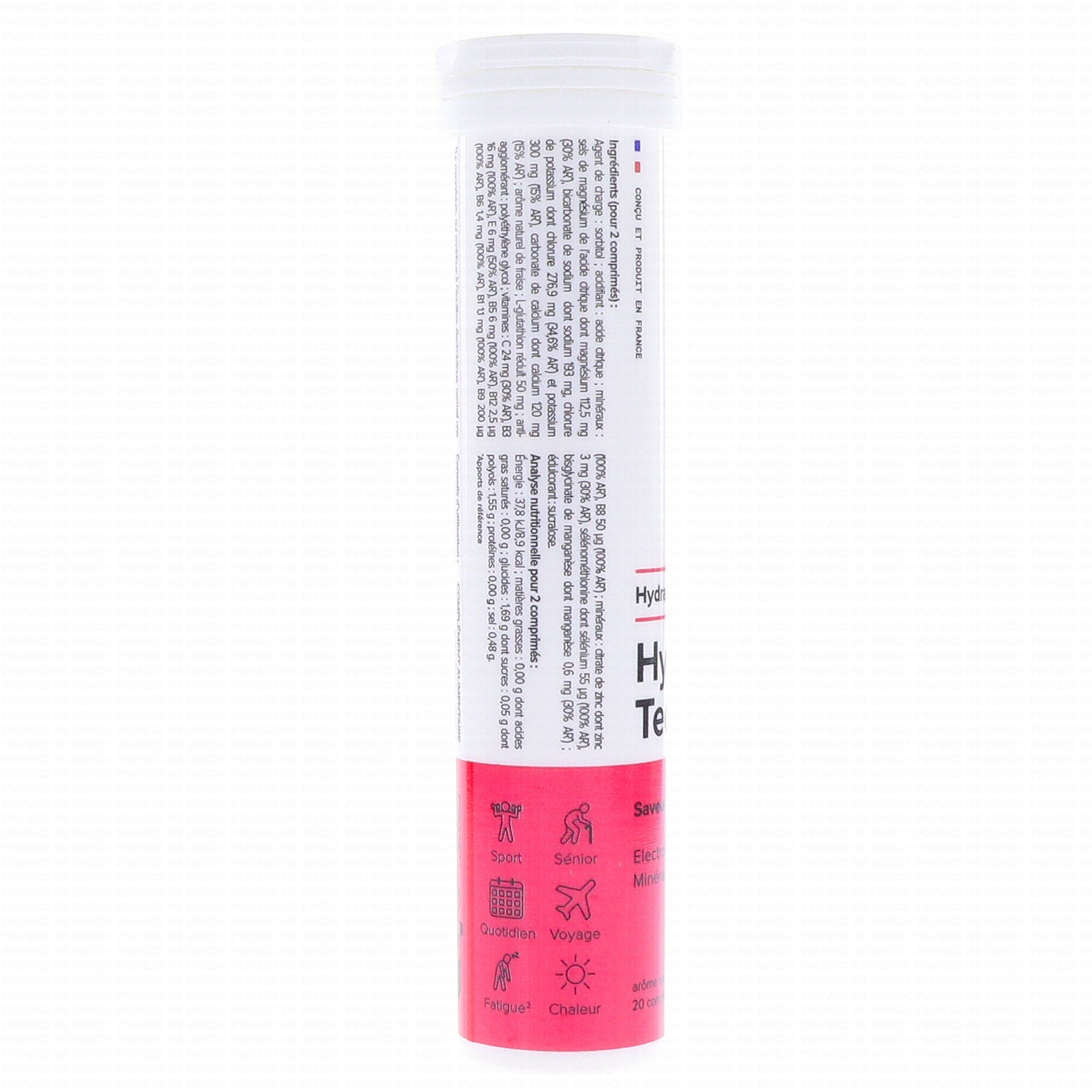 Fraise (pour 2 comprimés) : agent de charge : sorbitol ; acidifiant : acide citrique ; minérauxs : sels de magnésium de l'acide citrique dont magnésium 112,5 mg (30% AR*), bicarbonate de sodium dont sodium 193 mg, chlorure de potassium dont chlorure 276,9 mg (34,6% AR*) et potassium 300 mg (15% AR*) ; arôme naturel de fraise ; L-glutathion réduit 50 mg ; anti-agglomérant : polyéthylène glycol ; vitamines : C 24 mg (30% AR*), B3 16 mg (100% AR*), E 6 mg (50% AR*), B5 6 mg (100% AR*), B12 2,5 µg (100% AR*), N6 1,4 mg (100% AR*), B1 1,1 mg (100% AR*), B9 200 µg.