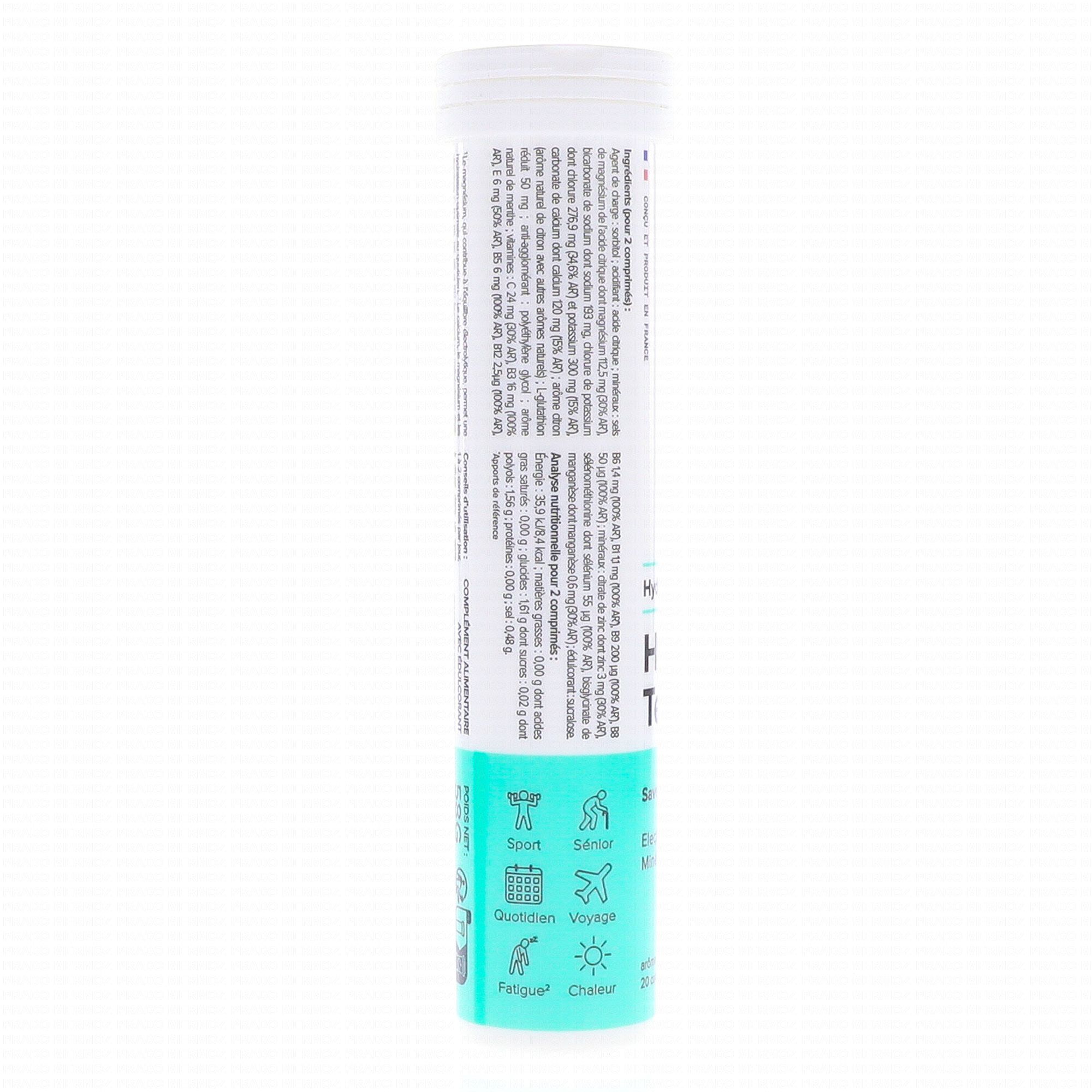 Menthe Citron (pour 2 comprimés) : agent de charge : sorbitol ; acidifiant : acide citriqsue ; minéraux : sels de magnésium de l'acide citrique dont magnésium 112,5 mg (30% AR*), bicarbonate de sodium dont sodium 193 mg, chlorure de potassium dont chlorure 276,9 mg (34,6% AR*) et potassium 300 mg (15% AR*), carbonate de calcium dont calcium 120 mg (15% AR*) ; arôme naturel ; L-glutathion réduit 50 mg ; anti-agglomérant : polyéthylène glycol ; vitamines : C 24 mg (30% AR*), B3 16 mg (100% AR*), E 6 mg (50% AR*), B5 6 mg (100% AR*), B12 2,5 µg (100% AR*), B6 1,4 mg (100% AR*), B1 1,1 mg.