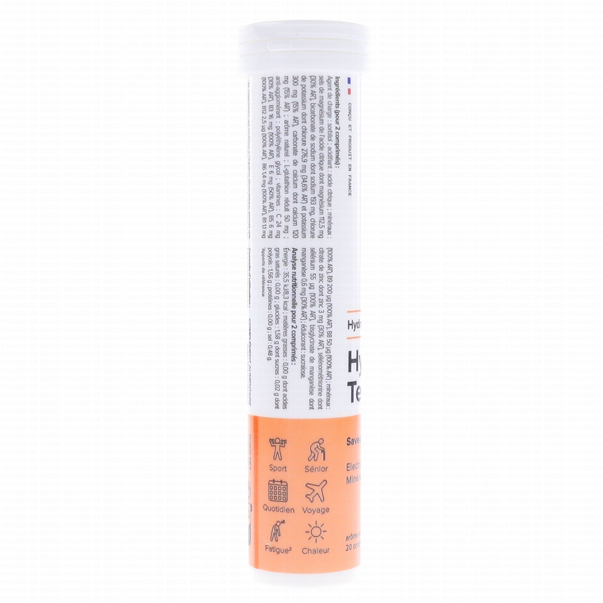 Pêche (pour 2 comprimés) : agent de charge : sorbitol ; acidifiant : acide citriqsue ; minéraux : sels de magnésium de l'acide citrique dont magnésium 112,5 mg (30% AR*), bicarbonate de sodium dont sodium 193 mg, chlorure de potassium dont chlorure 276,9 mg (34,6% AR*) et potassium 300 mg (15% AR*), carbonate de calcium dont calcium 120 mg (15% AR*) ; arôme naturel ; L-glutathion réduit 50 mg ; anti-agglomérant : polyéthylène glycol ; vitamines : C 24 mg (30% AR*), B3 16 mg (100% AR*), E 6 mg (50% AR*), B5 6 mg (100% AR*), B12 2,5 µg (100% AR*), B6 1,4 mg (100% AR*), B1 1,1 mg.