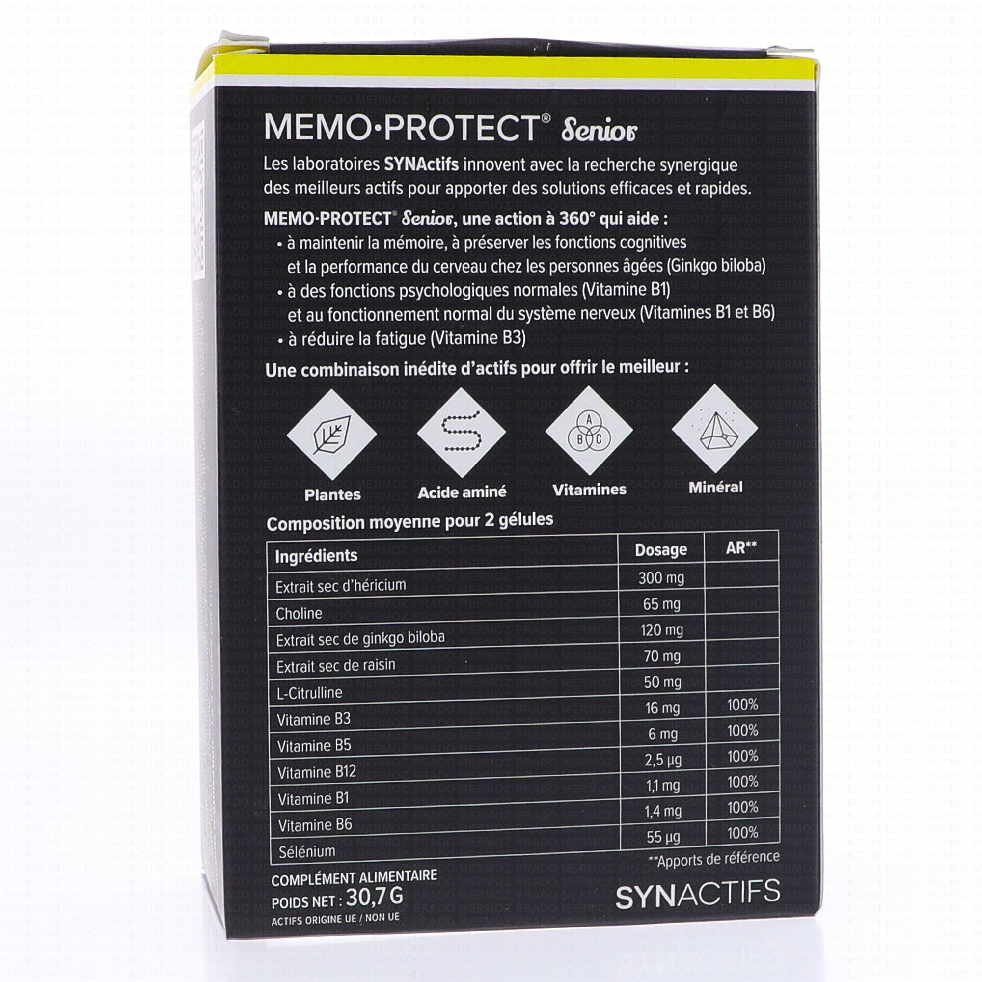 SYNACTIFS Memo-protect x60 gélules est un complément alimentaire qui contribue au maintien de bonnes fonctions cognitives grâce à la présence de Ginko biloba. Les vitamines B3, B6 et B1 aident au fonctionnement normal du système nerveux.
