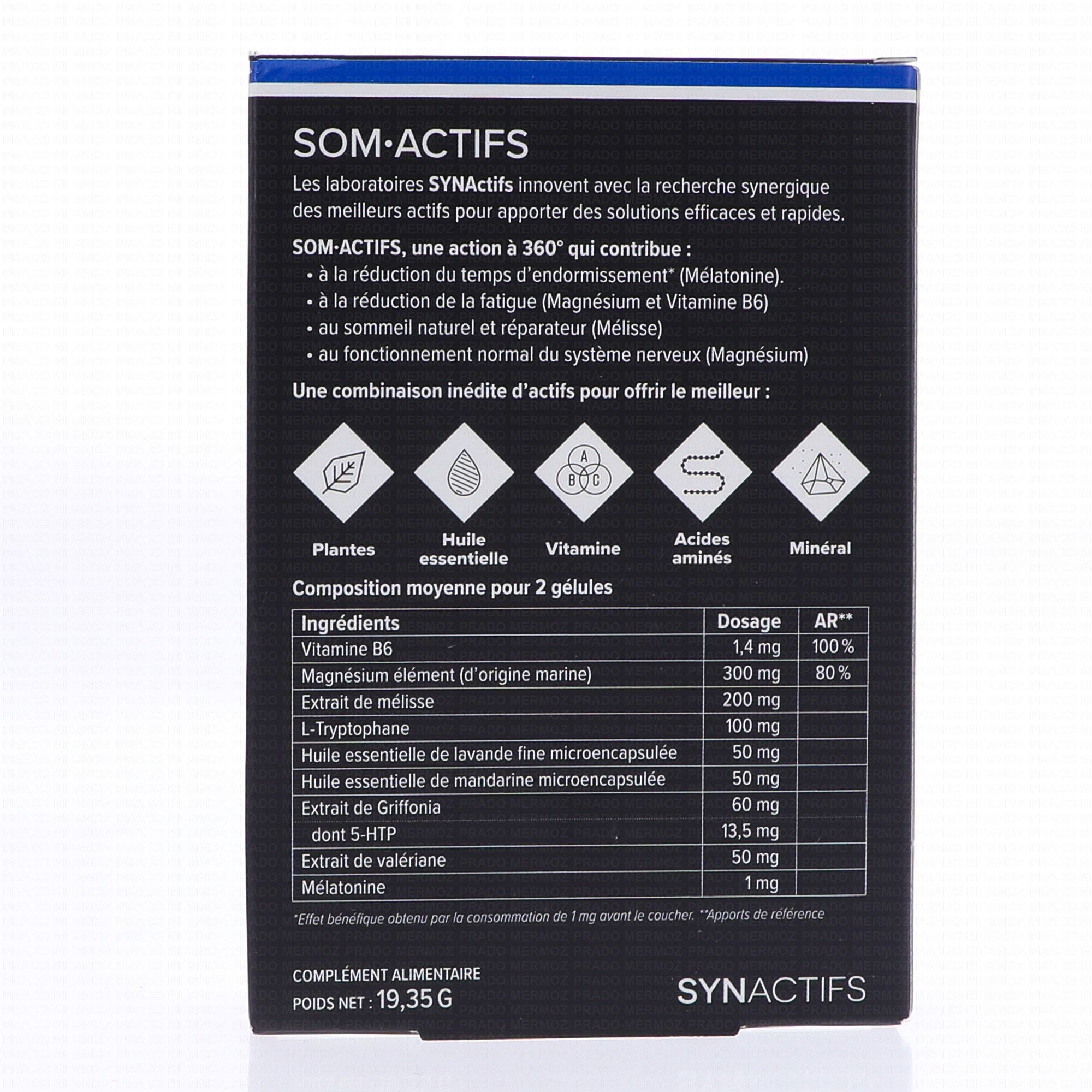 SYNACTIFS SOMActifs sommeil est un complément alimentaire qui contient de la melatonine, qui contribue à réduire le temps d'endormissement ainsi que de la mélisse et de la valériane qui contribuent à un sommeil de qualité.