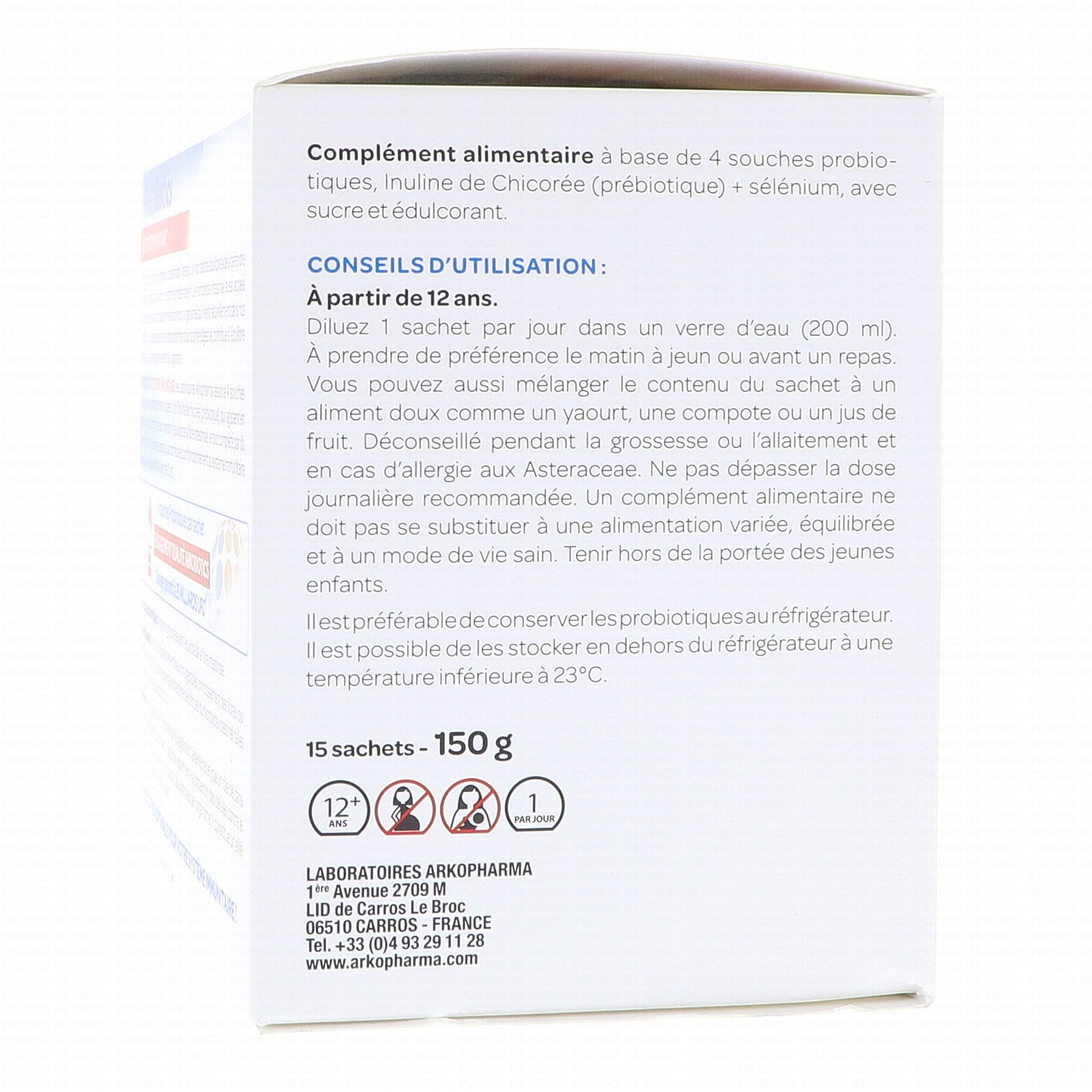 En stockARKOPHARMA ArkoBiotics Système Immunitaire Fort est un complément alimentaire qui contient 4 souches de probiotiques ( Lactobacillus paracasei LPC-37, Lactobacillus plantarum LP-115, Lactobacillus rhamnosus LR-32 et Lactobacillus acidophilus LA-14), un probiotique (l'inuline de chicorée) ainsi que du sélénium