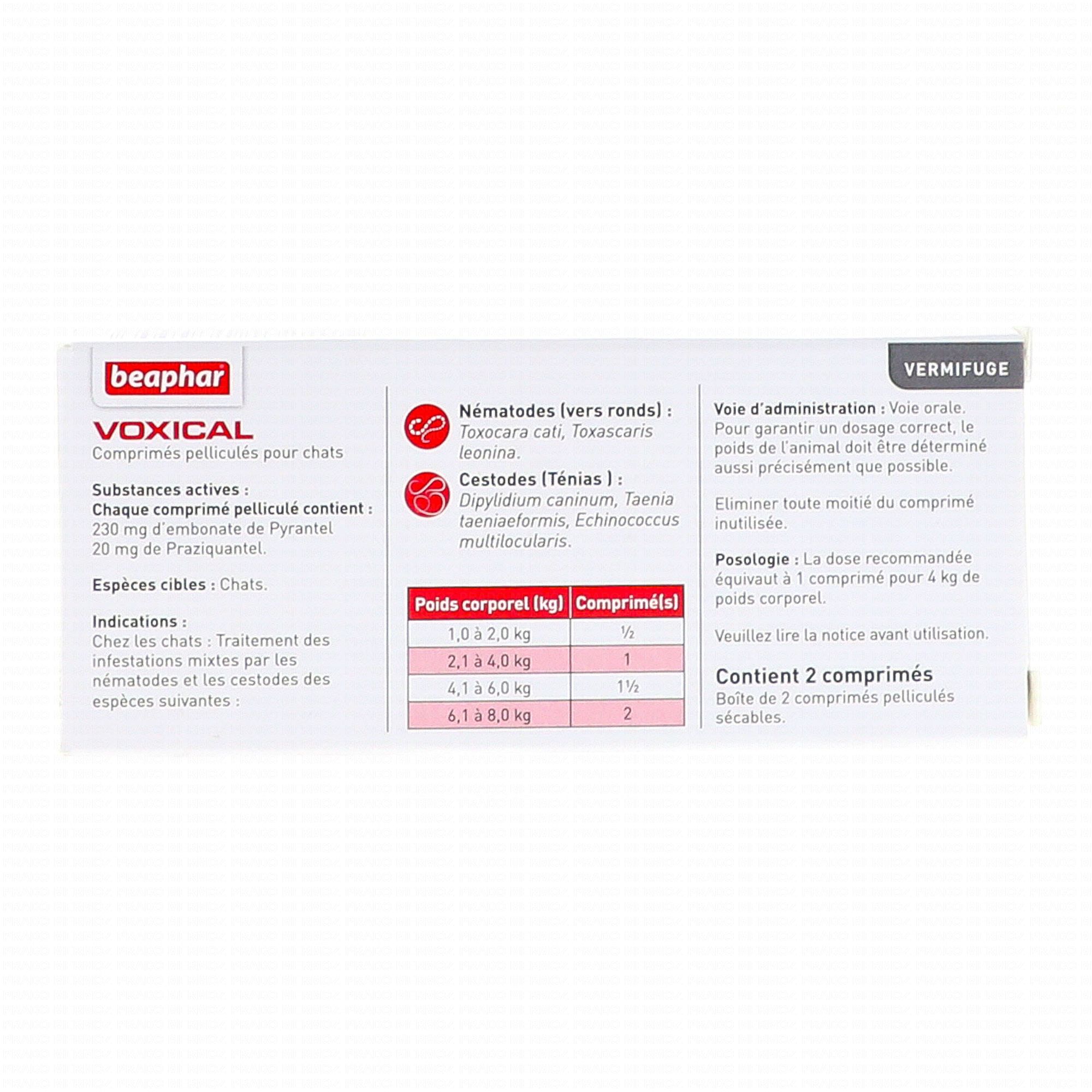 BEAPHAR Voxical Vermifuge Chats Chatons s'administre par voie orale. La dose recommandée est de 1 comprimé pour 4 kg de poids corporel. Pour les chats pesant moins de 2 kg, il est conseillé d'utiliser un vermifuge adapté aux chatons.