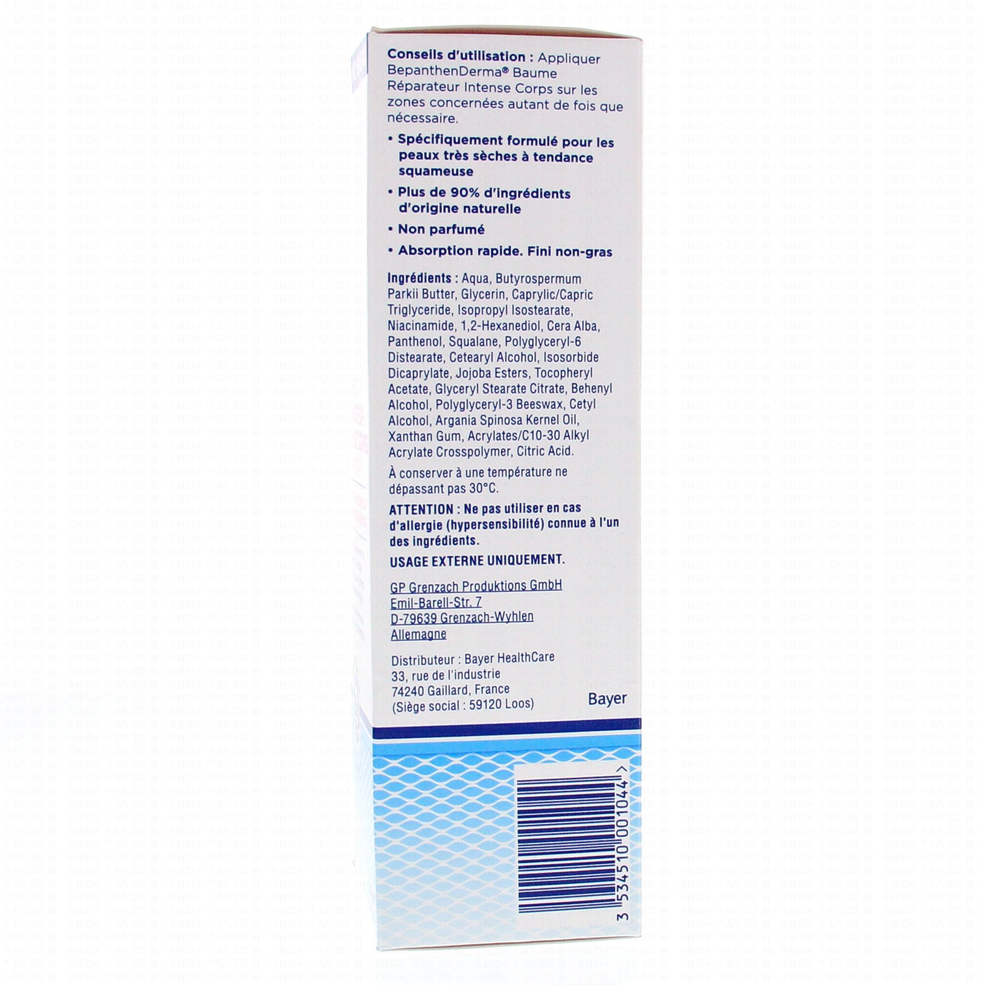 Bepanthen Derma Baume Réparateur Intense Corps agit à l'origine de la sécheresse cutanée. Il protège contre les pics récurrents de sécheresse extrême. Bepanthen Derma Baume Réparateur Intense Corps est un baume qui procure une hydratation intense pour un apaisement immédiat de la peau, même la plus sèche. Il laisse la peau lisse, douce et protégée de futurs pics de sécheresse cutanée extrême. En agissant sur les causes sous-jacentes de la sécheresse cutanée, cette formule spécifique assure une protection durable.