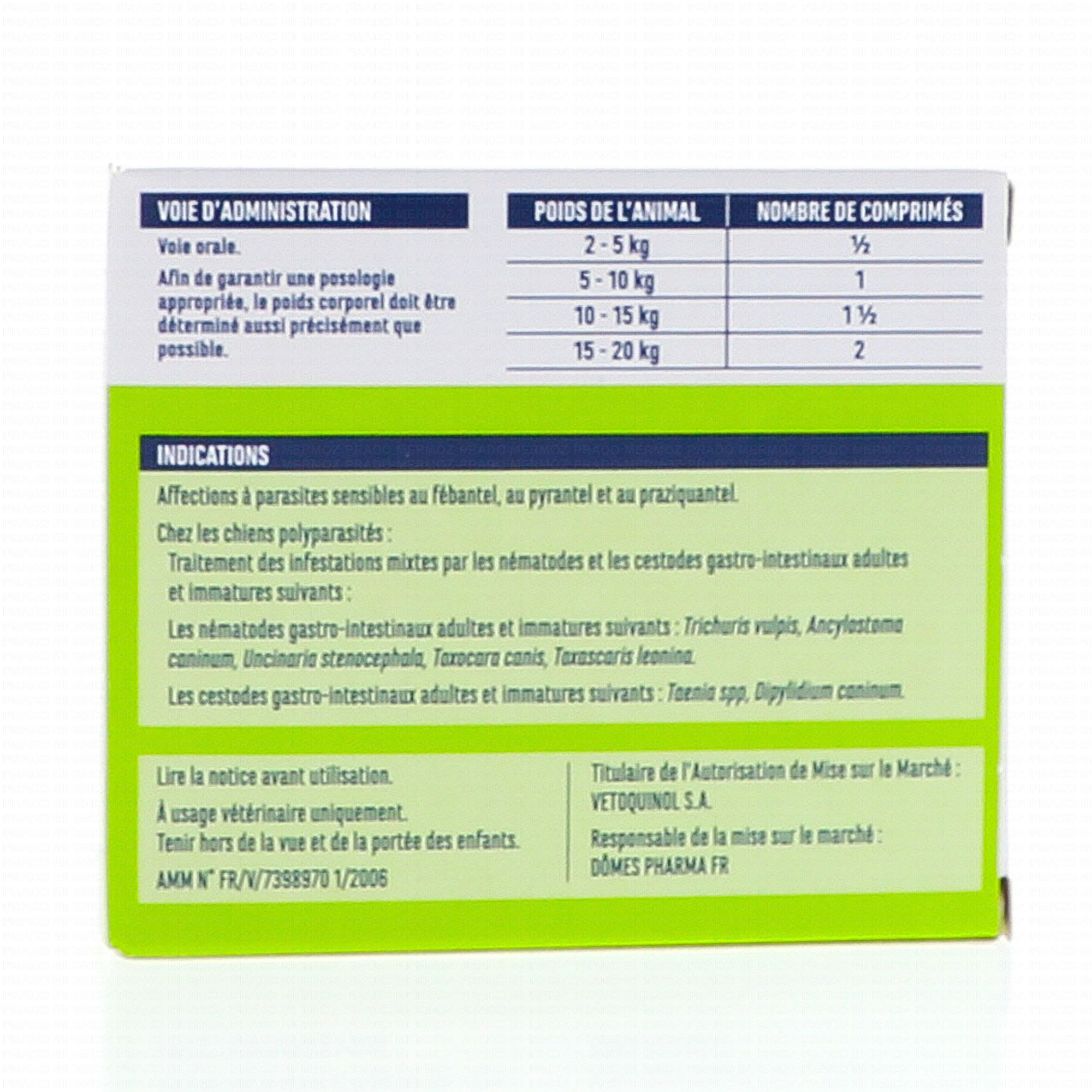 Vermifuge pour chien (de + de 2kg). Agit contre les vers plats et ronds. 4 comprimés sécables.