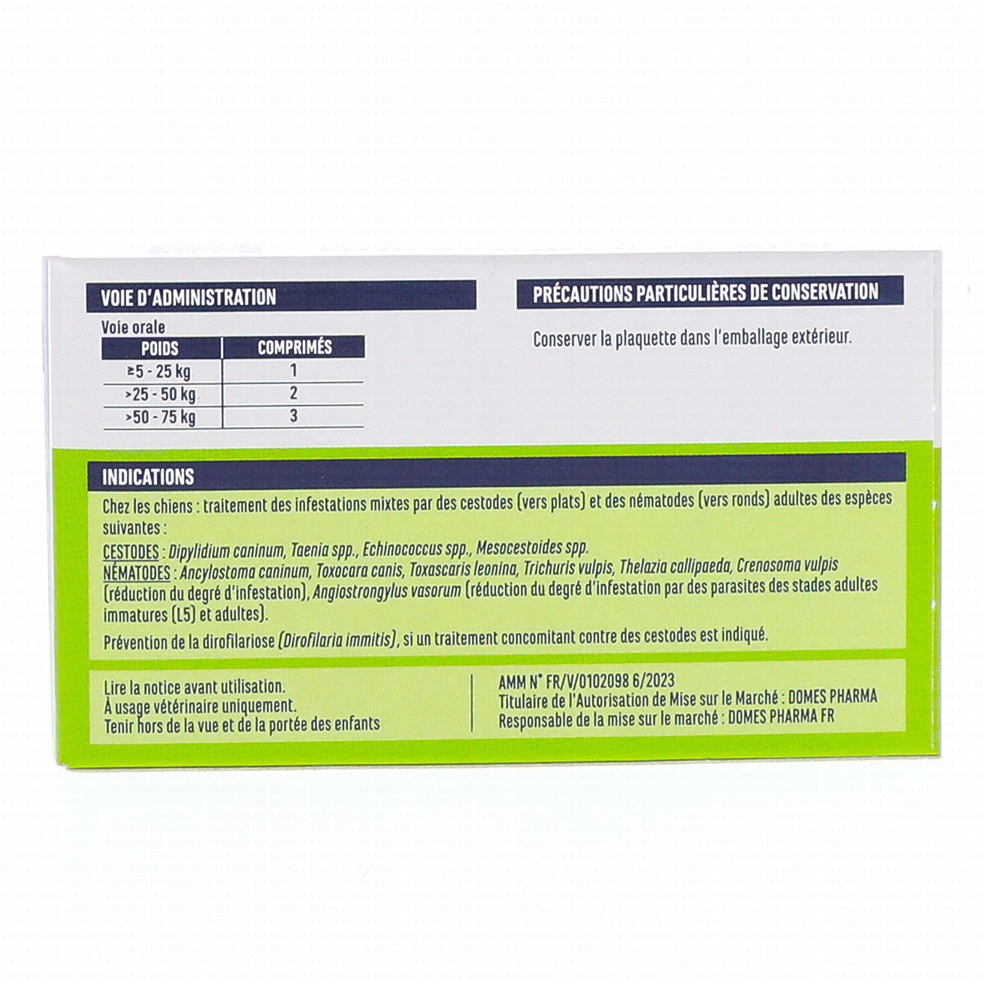 2 comprimés pelliculés. Traite les vers ronds et plats. Chien (de + de 5kg).