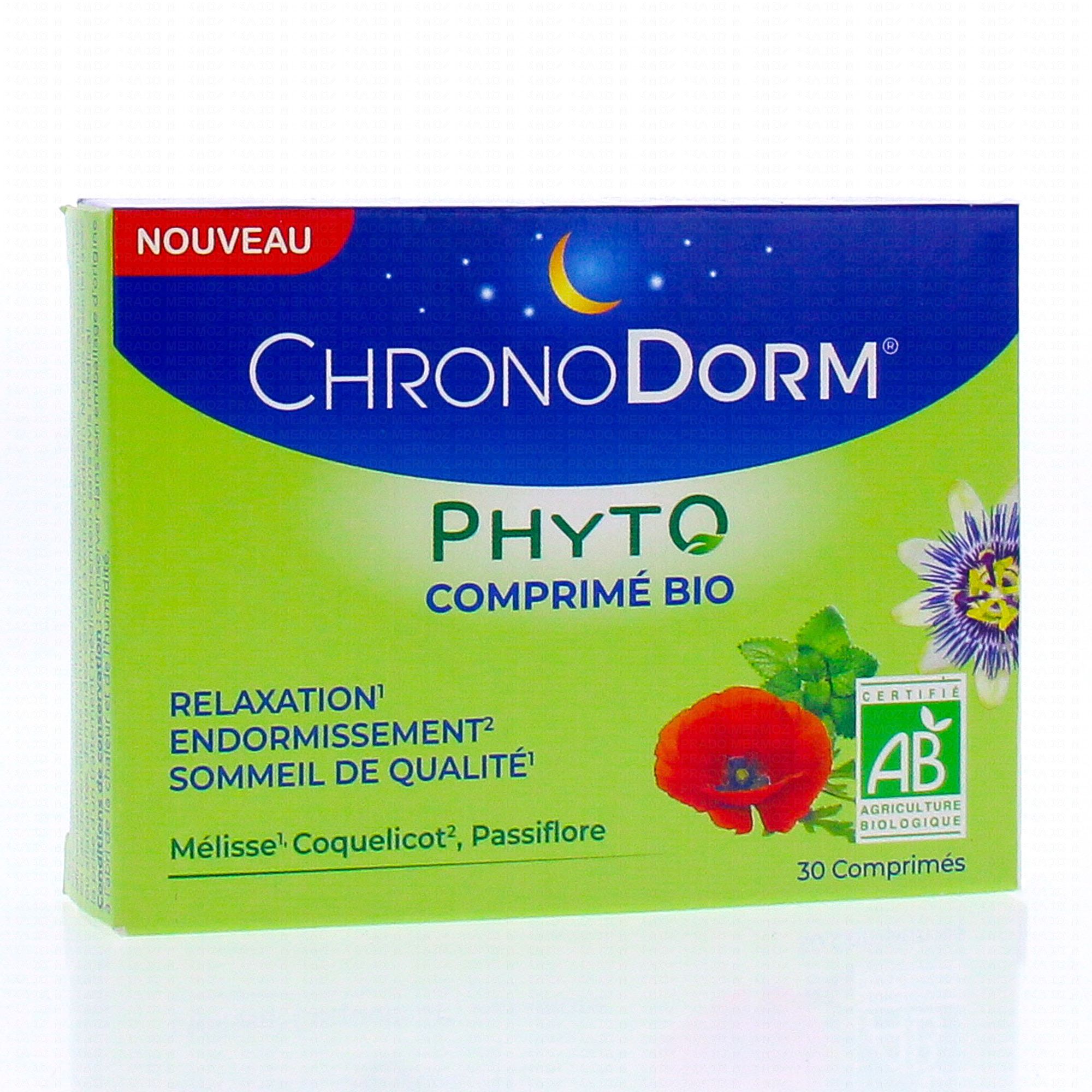 IPRAD Chronodorm phyto bio relaxation endormissement 30 comprimés est un complément alimentaire qui contribue à induire un sommeil de qualité grâce à la présence de Coquelicot, de Mélisse et de Passiflore.