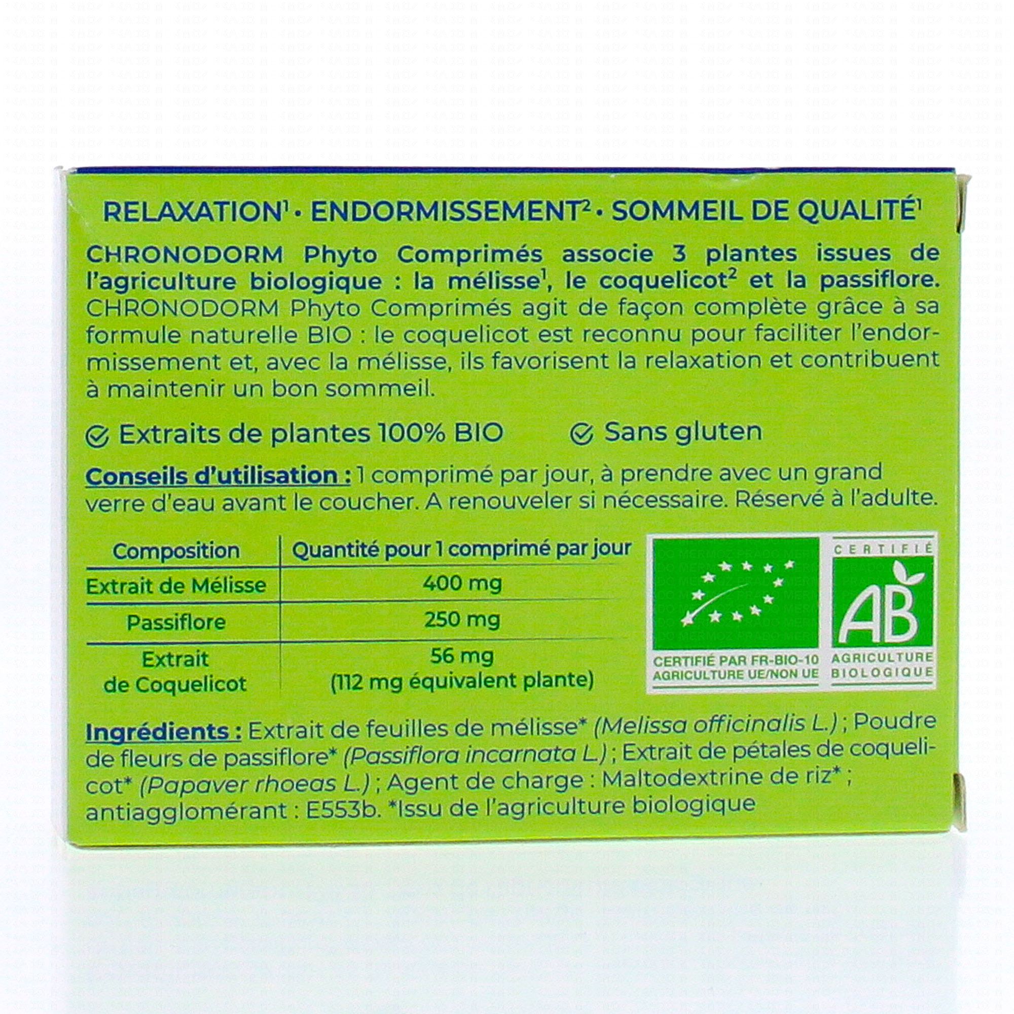 IPRAD Chronodorm phyto bio relaxation endormissement 30 comprimés contient les éléments suivants :