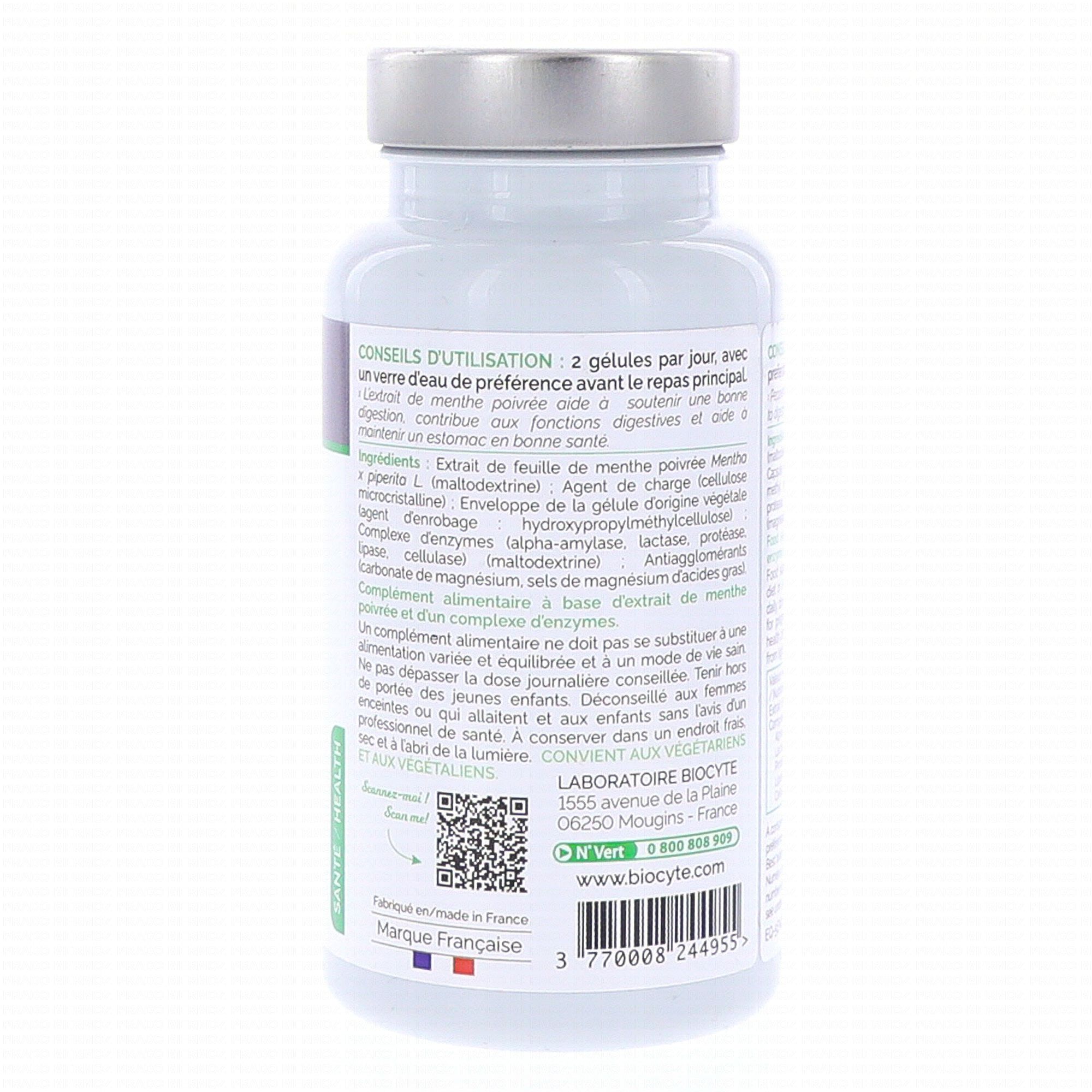 Extrait de feuille de menthe poivrée Mentha x piperita L. (maltodextrine) ; Agent de charge (cellulose microcristalline) ; Enveloppe de la gélule d'origine végétale (agent d'enrobage : hydroxypropylméthylcellulose) ; complexe d'enzymes (alpha-amylase, lactase, protéase, lipase, cellulase) (maltodextrine) ; Antiagglomérants (carbonate de magnésium, sels de magnésium d'acides gras).