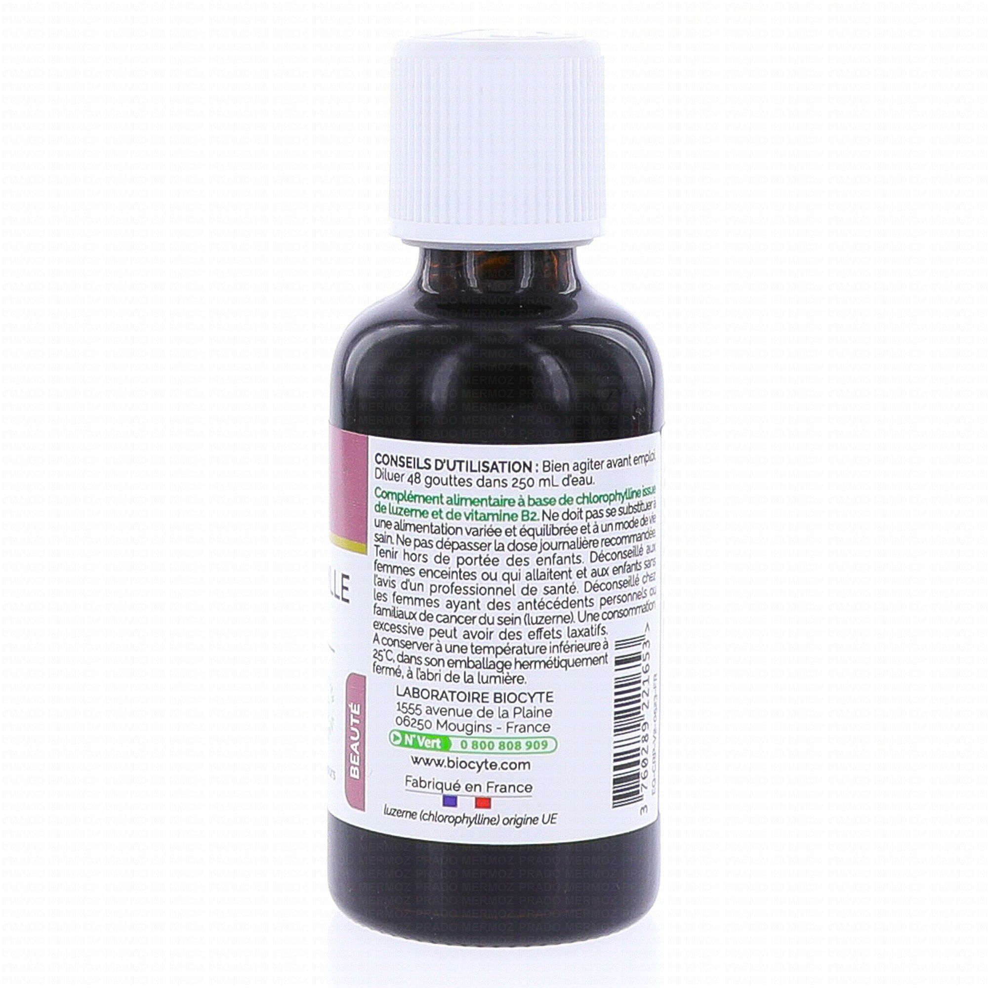 BIOCYTE Chlorophylle 50ml est un complément alimentaire à base de chlorophylline et de vitamine B2