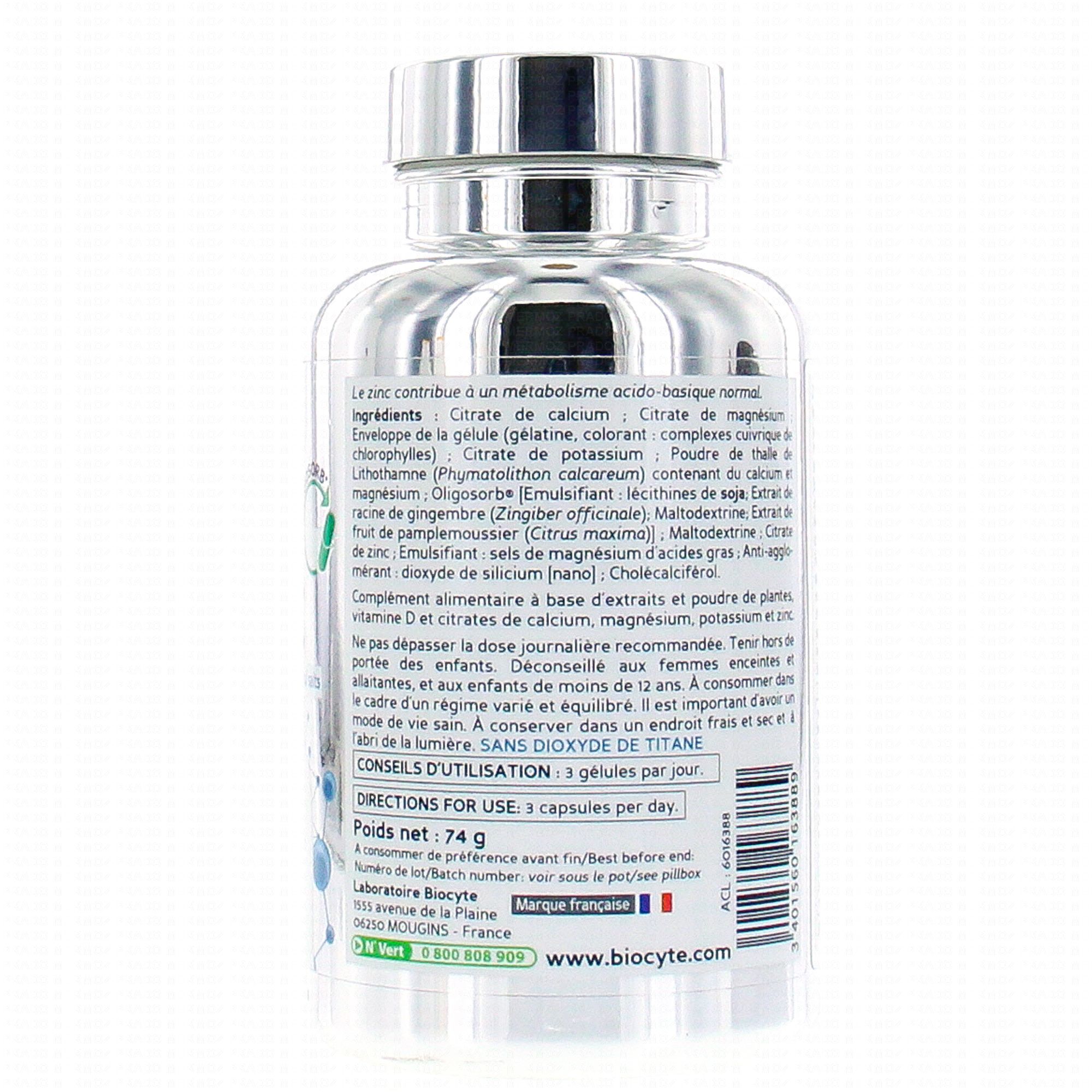 Citrate de calcium ; Citrate de magnésium ; Enveloppe de la gélule (gélatine, colorant : complexes cuivrique de chlorophylles) ; Citrate de potassium ; Poudre de thalle de Lithothamne (Phymatolithon calcareum) contenant du calcium et magnésium ; Oligosorb® [Emulsifiant : lécithines de soja; Extrait de racine de gingembre (Zingiber officinale); Maltodextrine; Extrait de fruit de pamplemoussier (Citrus maxima)] ; Maltodextrine ; Citrate de zinc ; Emulsifiant : sels de magnésium d'acides gras ; Anti-agglomérant : dioxyde de silicium [nano] ; Cholécalciférol.