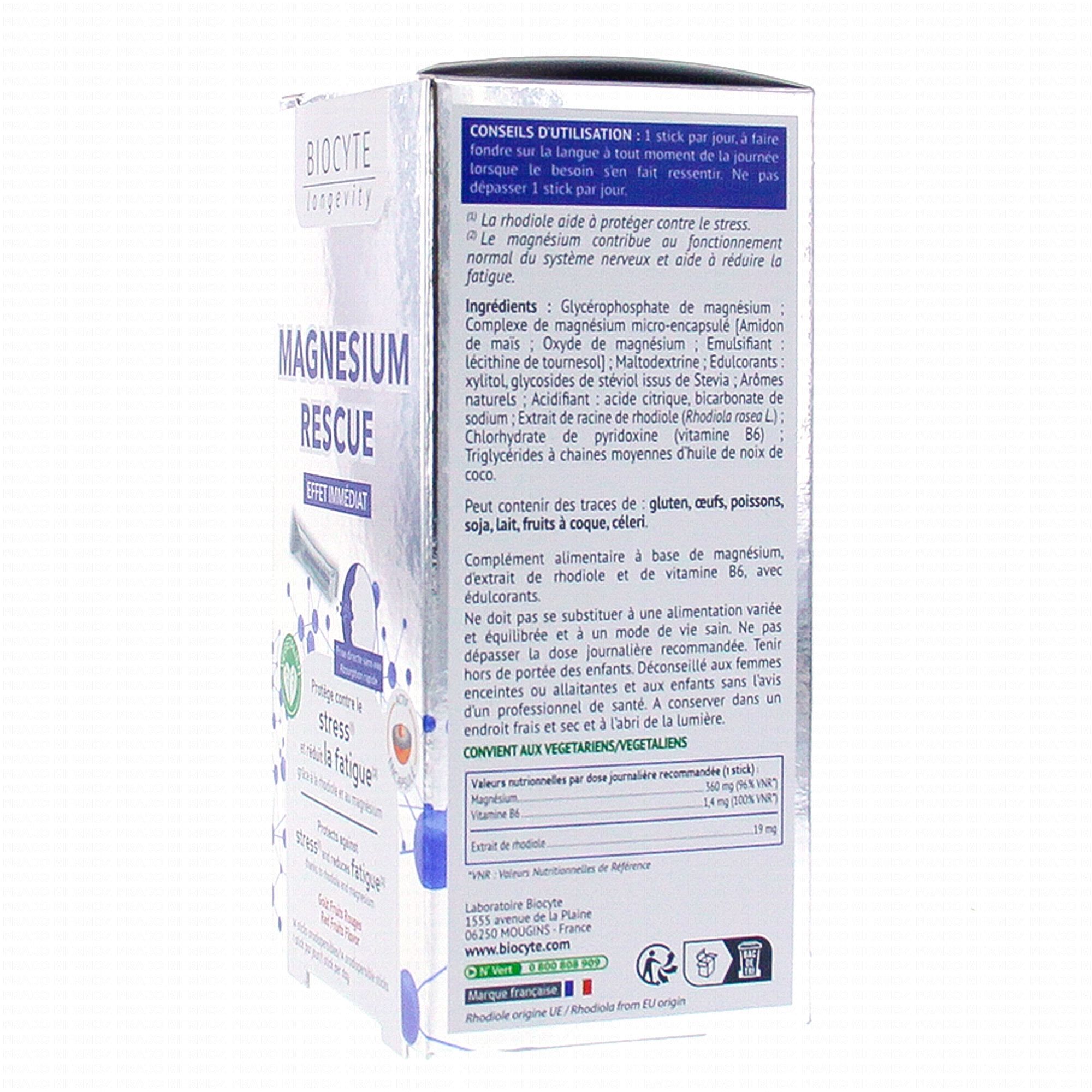 BIOCYTE Magnésium Rescue 14 sticks est un complément alimentaire qui contribue à réduire la fatigue et au fonctionnement normal du système nerveux grâce à la présence de Magnésium. La Rhodiole soutient les fonctions adaptogènes de l'organisme.