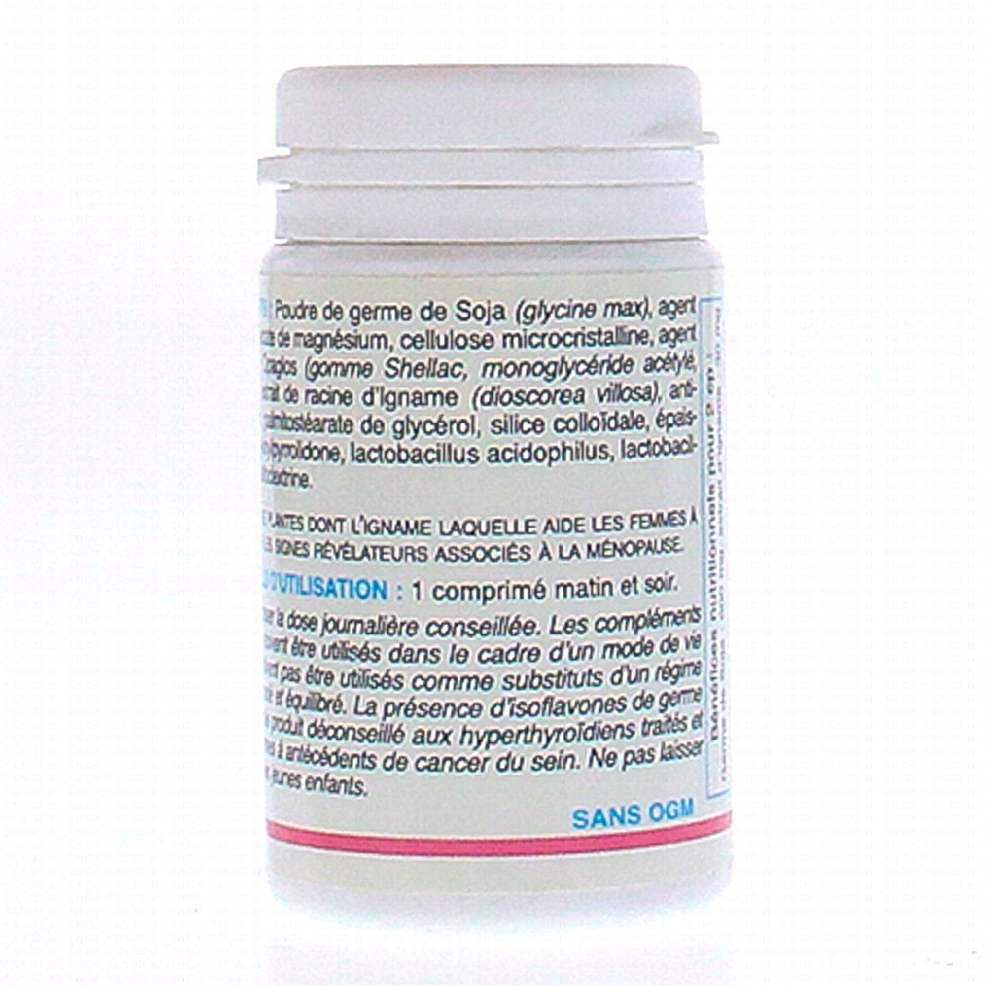 Poudre de germe de soja (Glycine max), agent de charge : lactate de magnésium, cellulose microcristalline, agent d'enrobage : Opaglos (gomme Shellac, monoglycéride acétylé, polyvidone), extrait de racine d'Igname (dioscorea opposita), anti-agglomérant : palmitostéarate de glycérol, silice colloïdale [nano], épaississant : polyvinylpyrrolidone, lactobacillus acidophilus, lactobacillus caséï, maltodextrine.