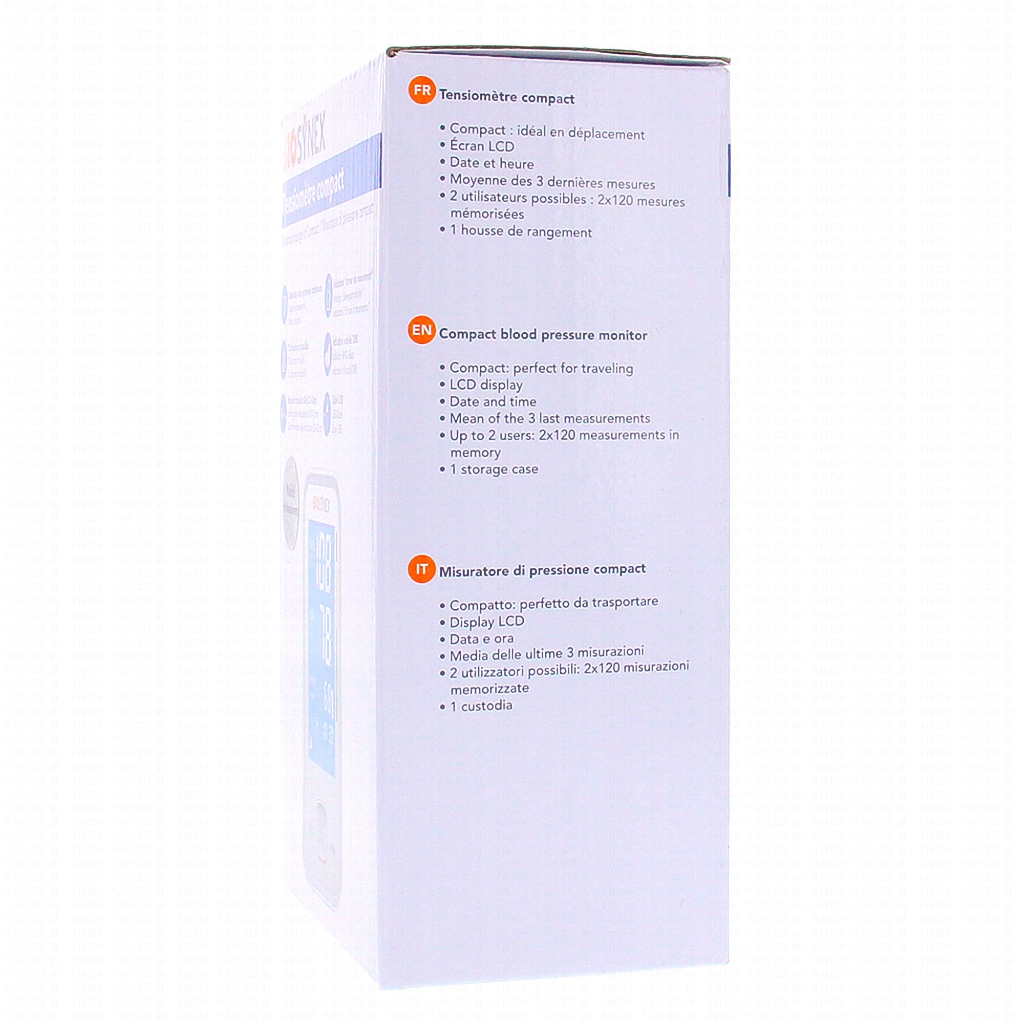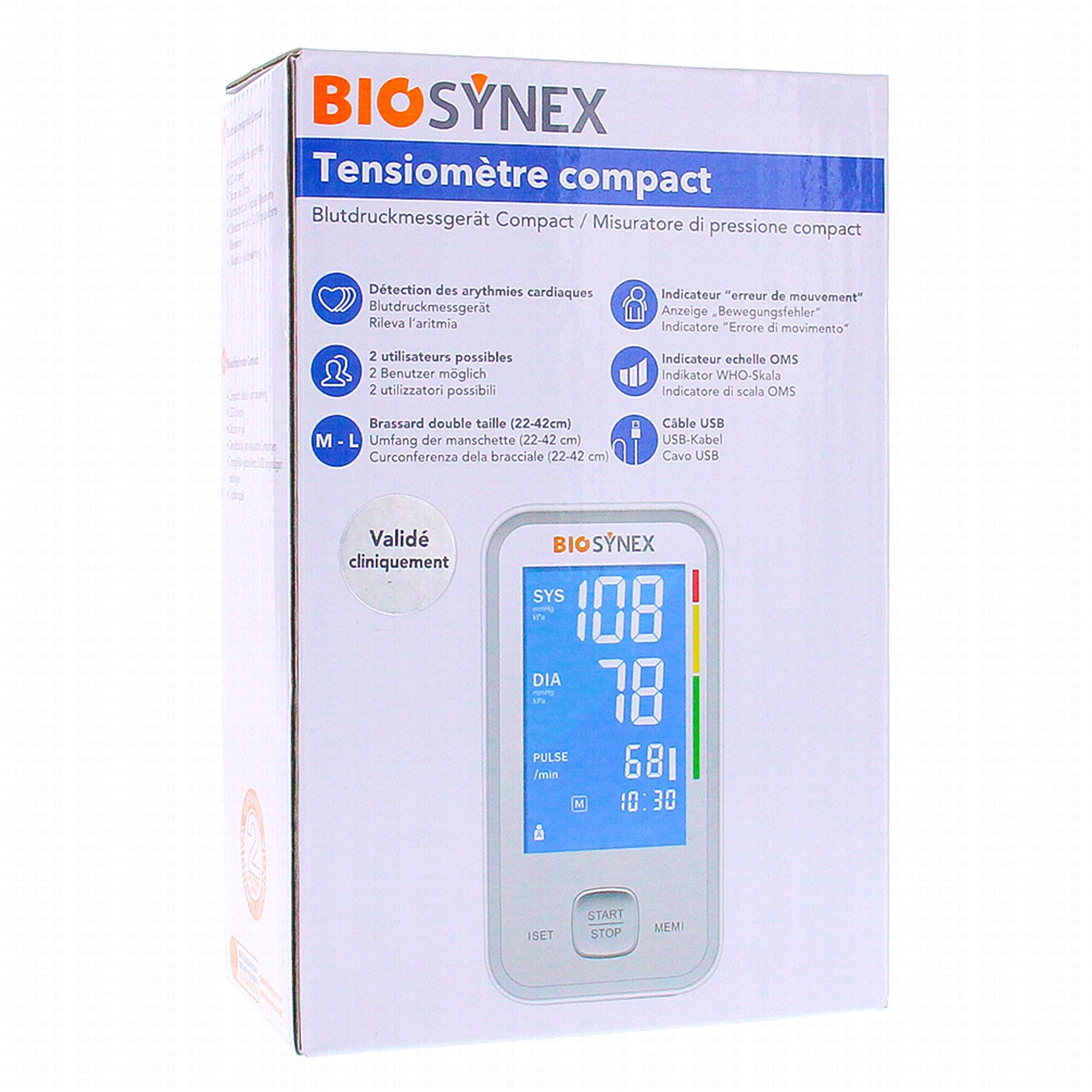 Biosynex Tensiomètre Compact est un appareil destiné à la surveillance de la tension artérielle et à la détection des arythmiques cardiaques.