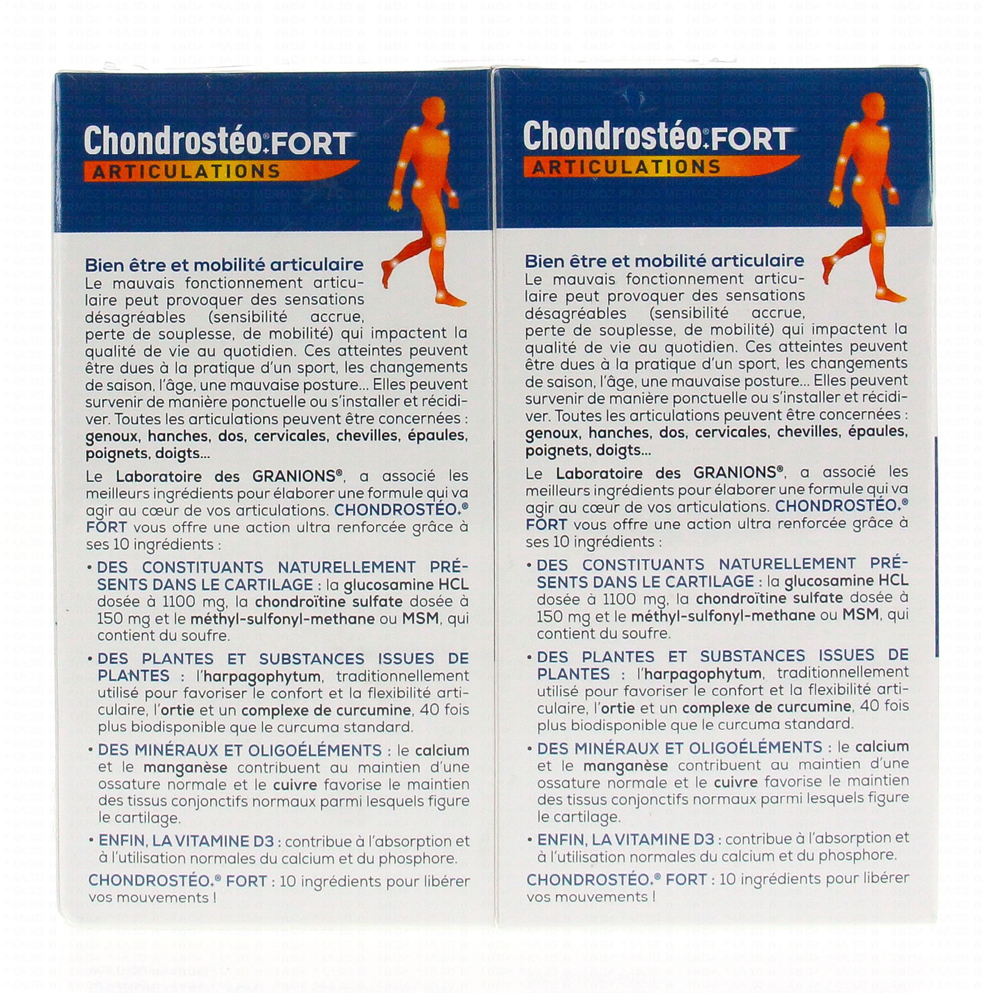 LABORATOIRE DES GRANIONS Chondrostéo Fort Articulations 2 boites de 120 comprimés est un complément alimentaire qui contribue à soutenir la flexibilité et la mobilité des articulations grâce à la présence de Glucosamine, de Chondroïtine, d'Harpagophytum et de Curcuma. Le cuivre aide au maintien de tissus conjonctifs normaux.