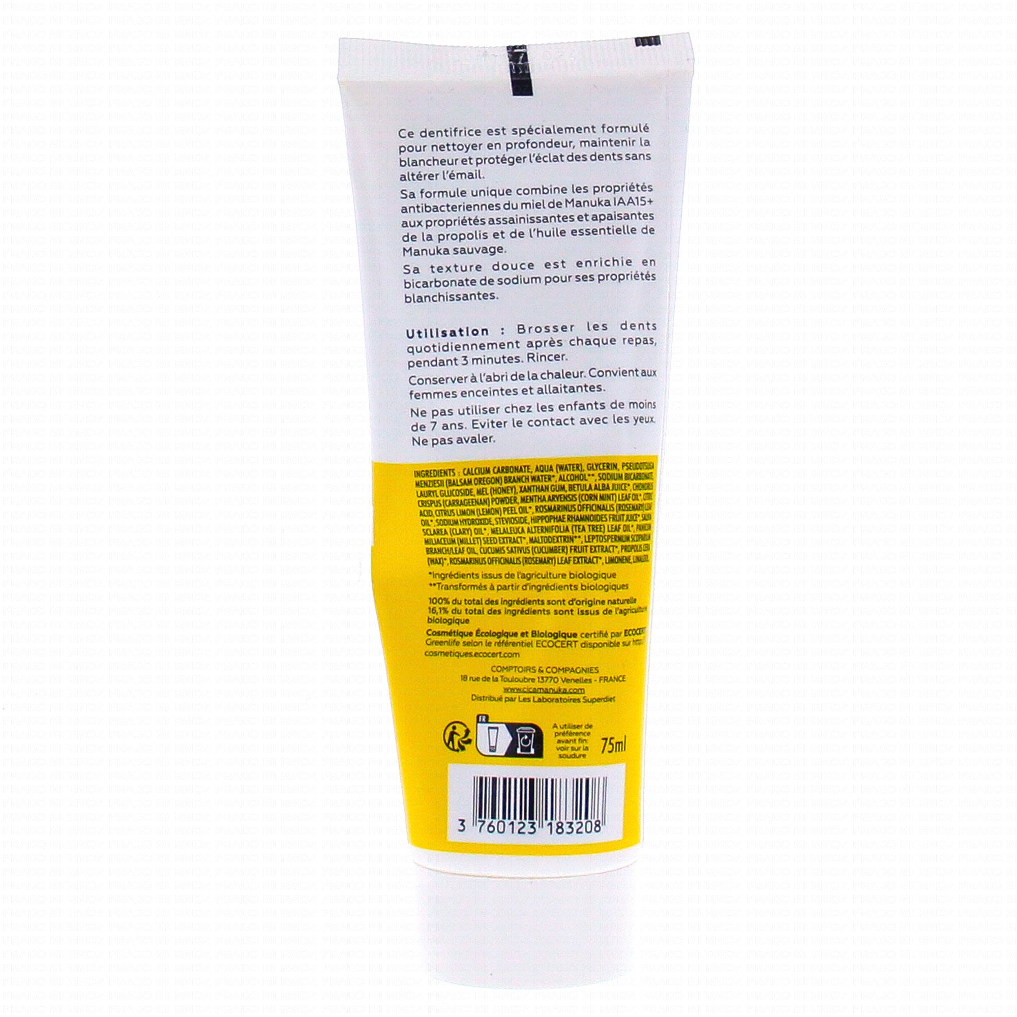 Le dentifrice blancheur de la marque CicaManuka est un dentifrice bio dont la formule est enrichie en miel de Manuka IAA 15+. Il aide à maintenir la blancheur et l'éclat naturels des dents.