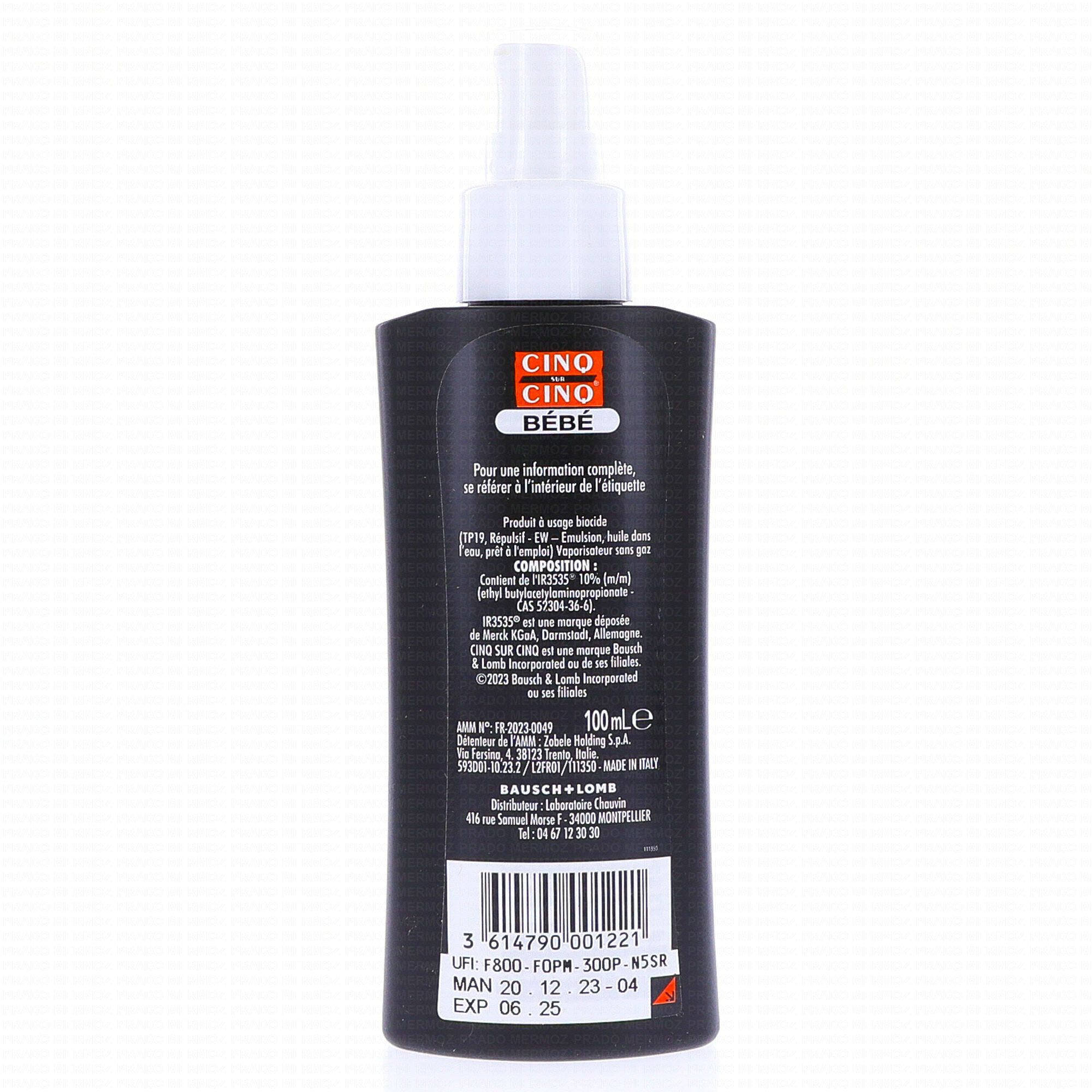 CINQ SUR CINQ bébé est une lotion anti-moustique. Produit à usage biocide à appliquer sur la peau pour protéger les humains contre les moustiques et les tiques uniquement dans les zones tempérées. Jusqu'à 8 heures de protection contre les moustiques (Culex, Aedes, Anopheles) et 7 heures contre les tiques (Ixodes scapularis, Ixodes ricinus). Produit à usage cutané destiné au grand public dès la naissance.