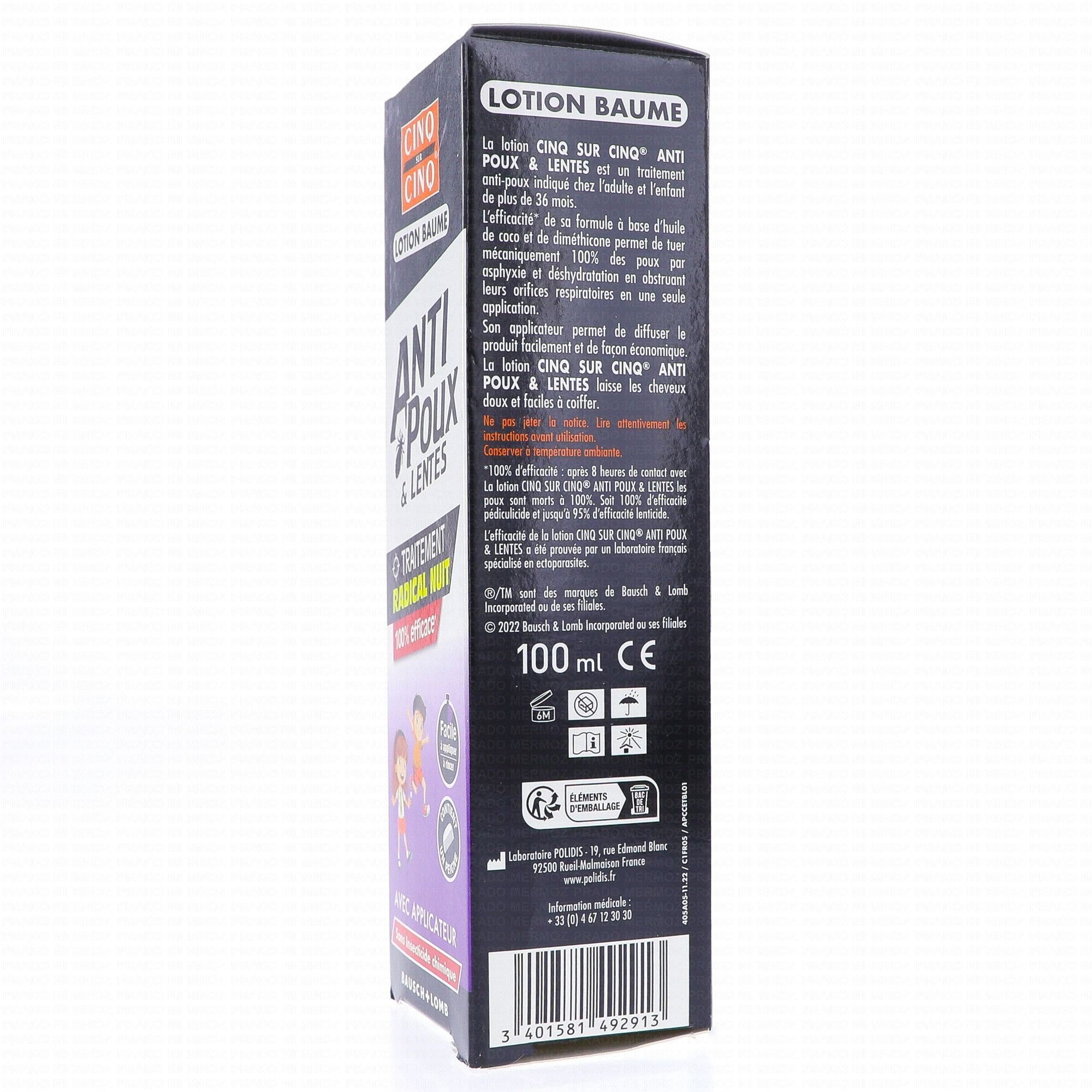 À base d'huile de coco et de diméthicone, l'anti-poux CINQ SUR CINQ permet d'éliminer 100% de poux et lentes mécaniquement par asphyxie et déshydratation. Grâce à son applicateur, étalez le produit sur l'ensemble de la chevelure uniformément.