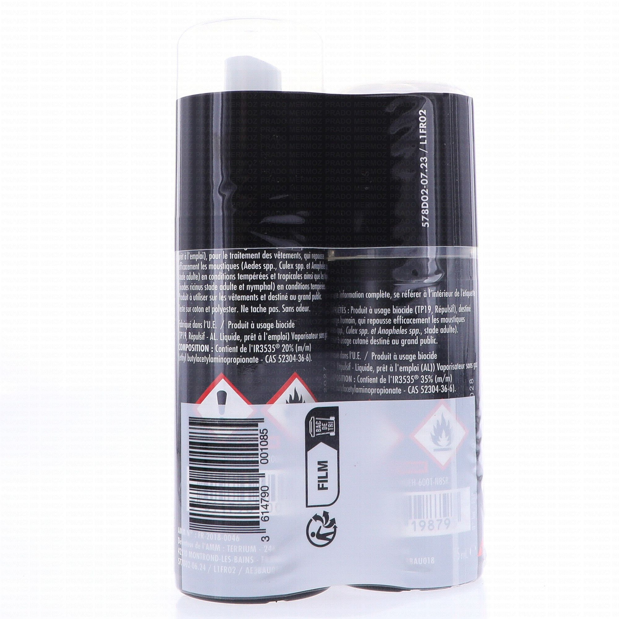 Spray Vêtements et Tissus : IR3535® 20% (m/m) (Ethyl Butylacetylaminopropionate - CAS 52304-36-6).