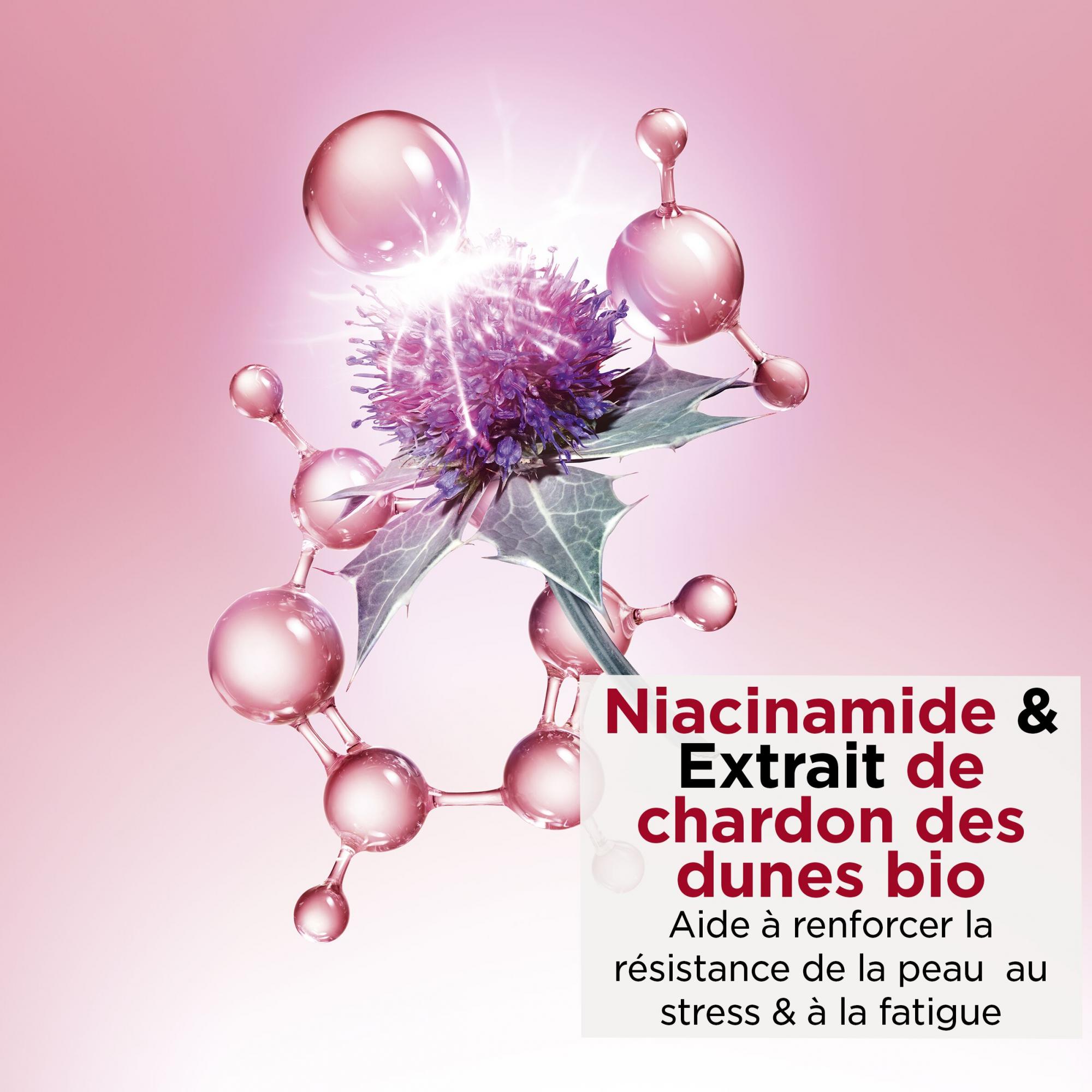 • [Skin Charger Complex] : le niacinamide, associé à l'extrait de chardon des dunes, forment un duo puissant qui aide à réduire les 1ers signes visibles de l'âge. La fonction barrière de la peau est renforcée, son éclat ravivé et sa jeunesse préservée.