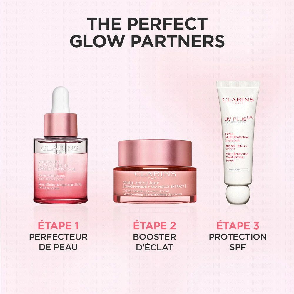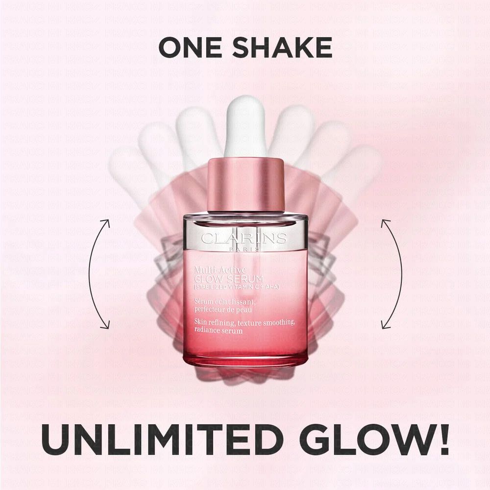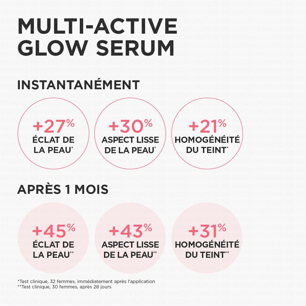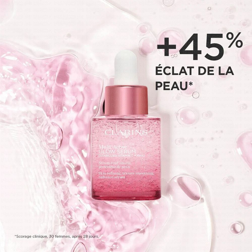 Ce sérum éclat contient de l'acide alpha-hydroxylé glycolique (AHA) qui peut augmenter la sensibilité au soleil. Utiliser un écran solaire et limiter l'exposition au soleil pendant l'utilisation du produit et la semaine suivante. Bien agiter avant usage.