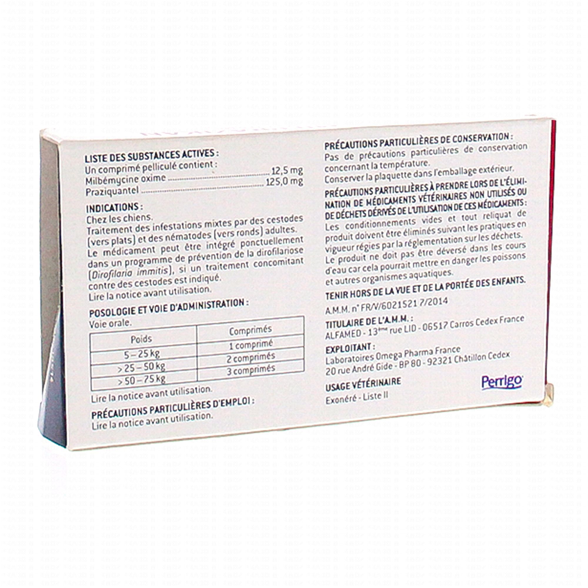 Ce médicament vétérinaire comporte de deux substances actives : la Milbémycine oxime (12,5 mg par comprimé) et le Praziquantel (125 mg par comprimé). Les excipients sont pour le noyau la cellulose microcristalline, la croscarmellose sodique, le lactose monohydraté, l'amidon prégélatinisé, la povidone, le stéarate de magnésium et la silice colloïdale anhydre, et pour le pelliculage l'arôme naturel de foie de volaille, l'hypromellose, la cellulose microcristalline et le stéarate de macrogol.