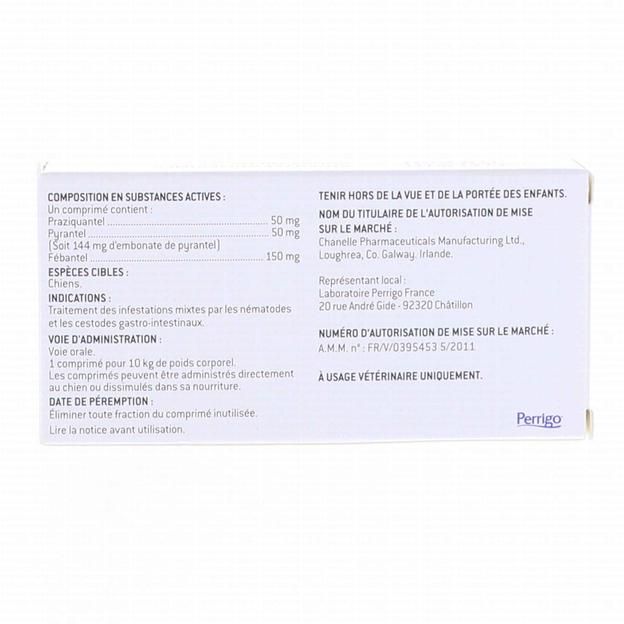 Pour garantir un dosage correct, le poids de l'animal doit être déterminé aussi précisément que possible. La dose recommandée est de 20 mg de pyrantel par kg de poids corporel (soit 57,5 mg d'embonate de pyrantel par kg) et de 5 mg de praziquantel par kg de poids corporel. Cela équivaut à 1 comprimé pour 4 kg de poids corporel.
