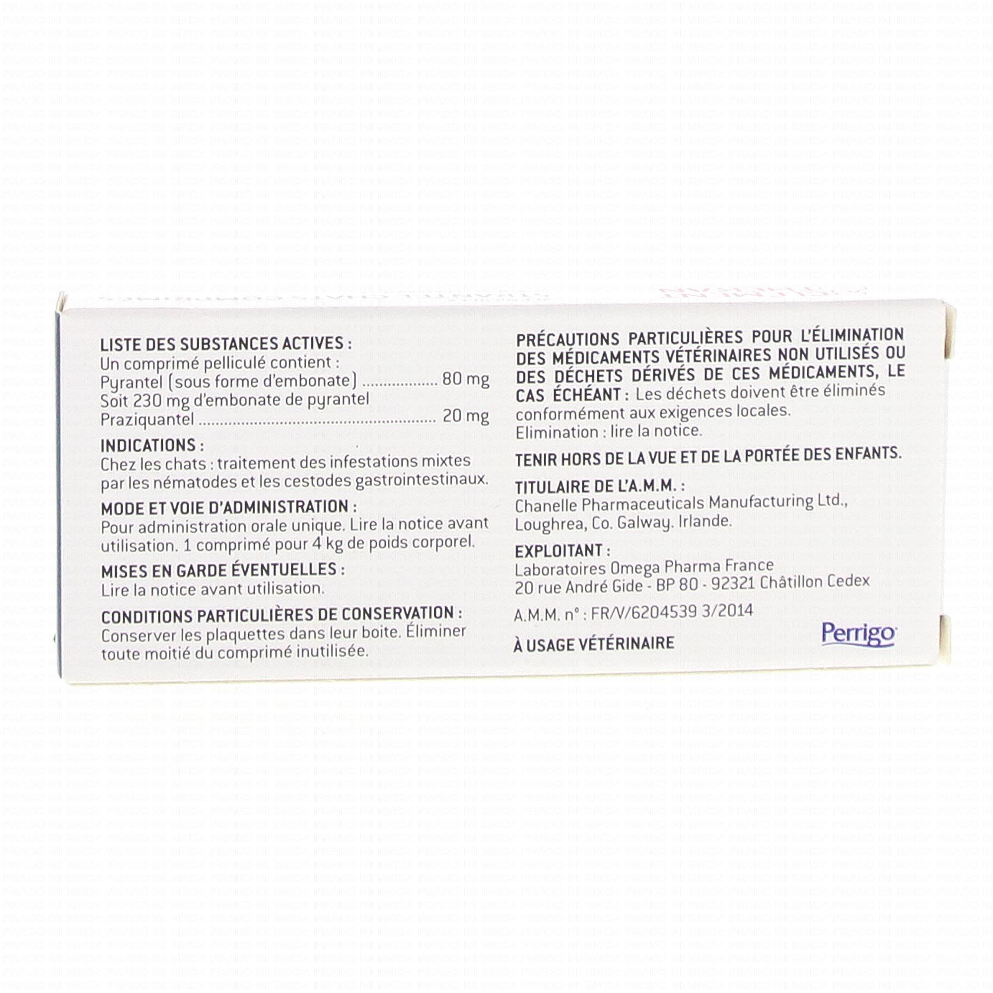 1 comprimé pélliculé contient 80mg de pyrantel (soit 230mg d'embonate de pyrantel) et 20 mg de praziquantel.