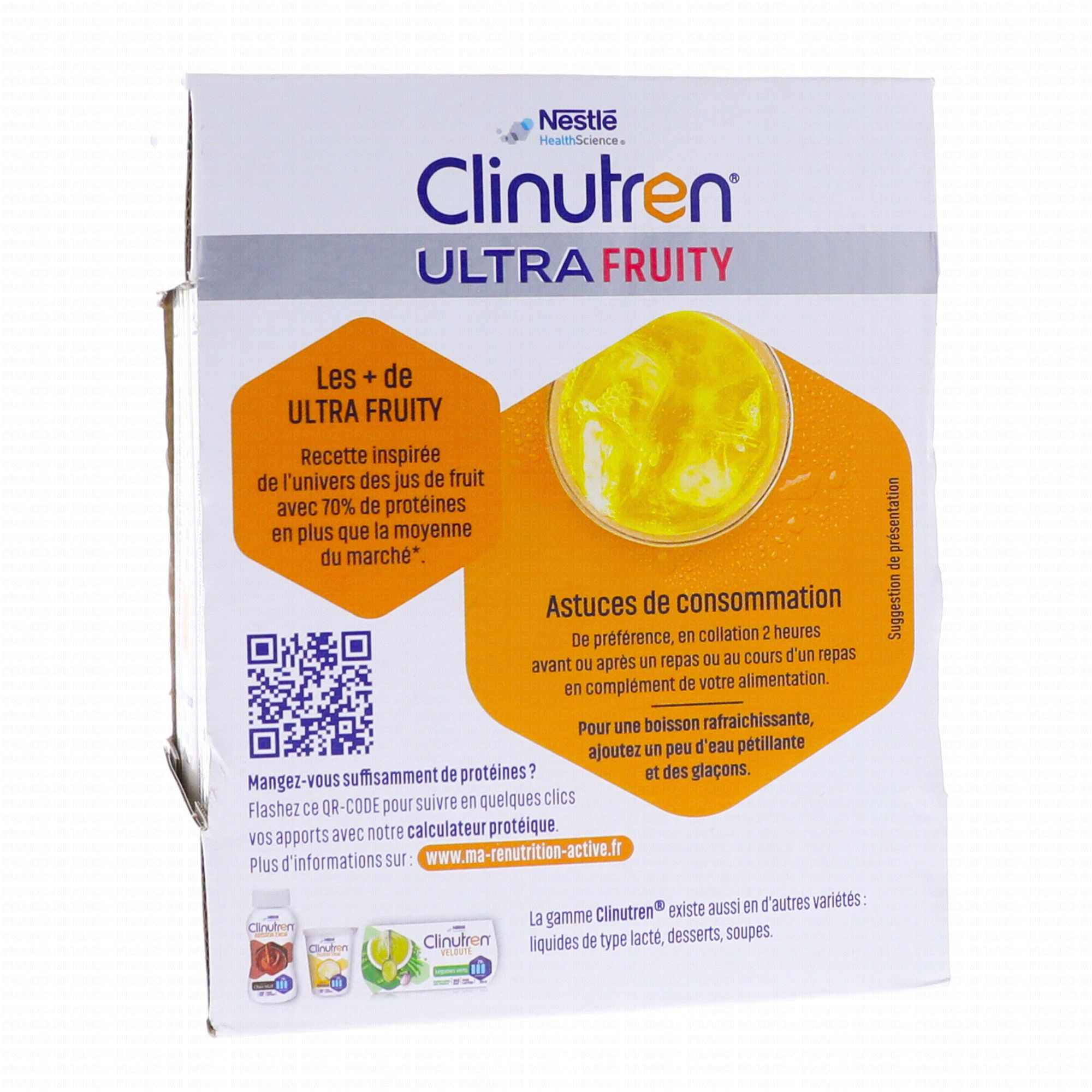 CLINUTREN Ultra Fruity est une boisson hyperprotéinée et hypercalorique destinée aux personnes souffrants de dénutrition ou en voie de dénutrition. Chaque brique apporte 300kcal et 14g de protéines.