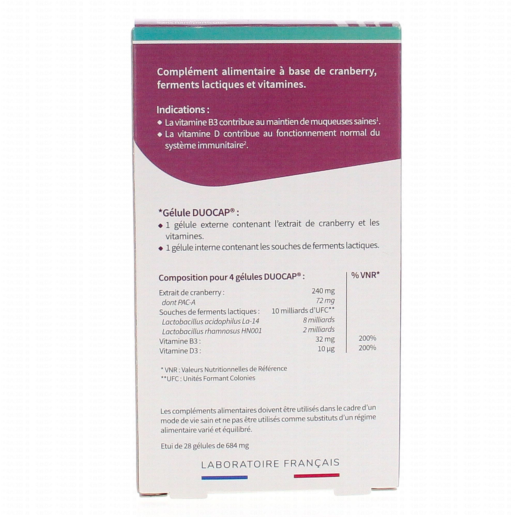 Humectant : glycérine d'origine végétale, tunique DUOCAP® : hydroxypropylméthylcellulose d'origine végétale, agent de charge : cellulose microcristalline d'origine végétale, extrait de fruit de cranberry (vaccinium macrocarpon Aiton) dosé en proanthocyanidine de type A (PAC-A), souches de ferments microbiotiques (lactobacillus acidophilus La-14 et lactobacillus rhamnosus HN001), vitamine B3 (nicotinamide), vitamine D3 (cholécalciférol), eau purifiée.