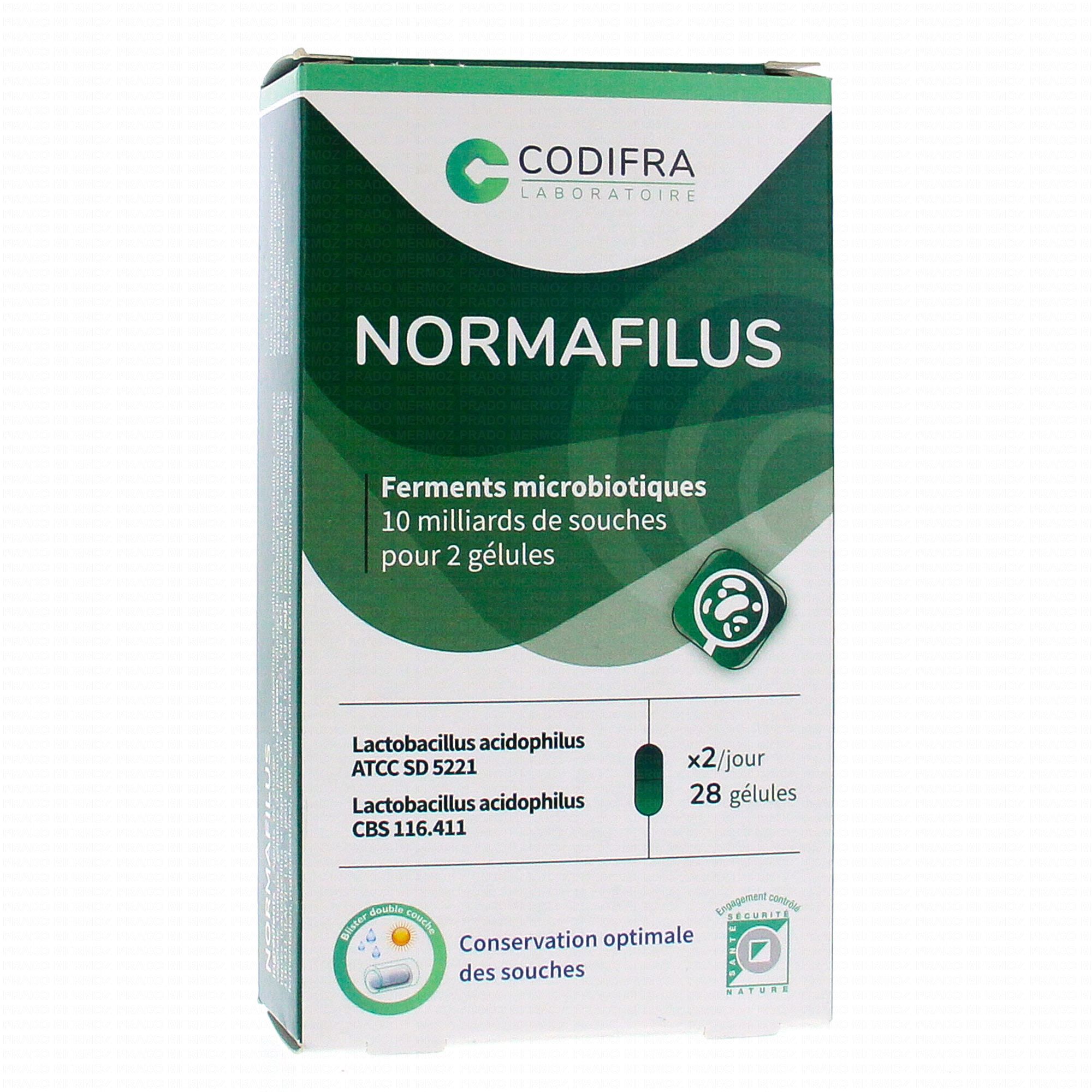 CODIFRA Normafilus intestin sensible x 28 gélules riche en probiotiques favorise le confort intestinal en maintenant et restaurant l'équilibre de la flore intestinale grace aux lactobacillus acidophilus.
