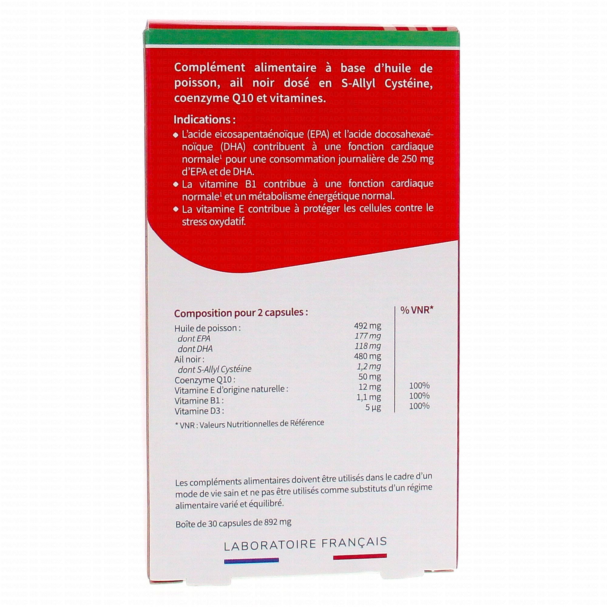 Huile de poisson dosée en acide eicosapentaénoïque (EPA) et acide docosahexaénoïque (DHA), extrait de bulbe d'ail noir (allium sativum L.) dosé en S-allyl cystéine (ABG10+® Premium obtenu par viellissement naturel), tunique : gélatine de peau de poisson, humectant : glycérol, anti-agglomérant : huile de tournesol, épaississant : mono et diglycérides d'acides gras, coenzyme Q10 (Kaneka Q10TM obtenu par biofermentation - ne contient pas de levure), émulsifiant : lécithine de tournesol, D-alpha tocophérol d'origine naturelle (vitamine E), mononitrate de thiamine (vitamine B1), cholécalciférol (vitamine D3).