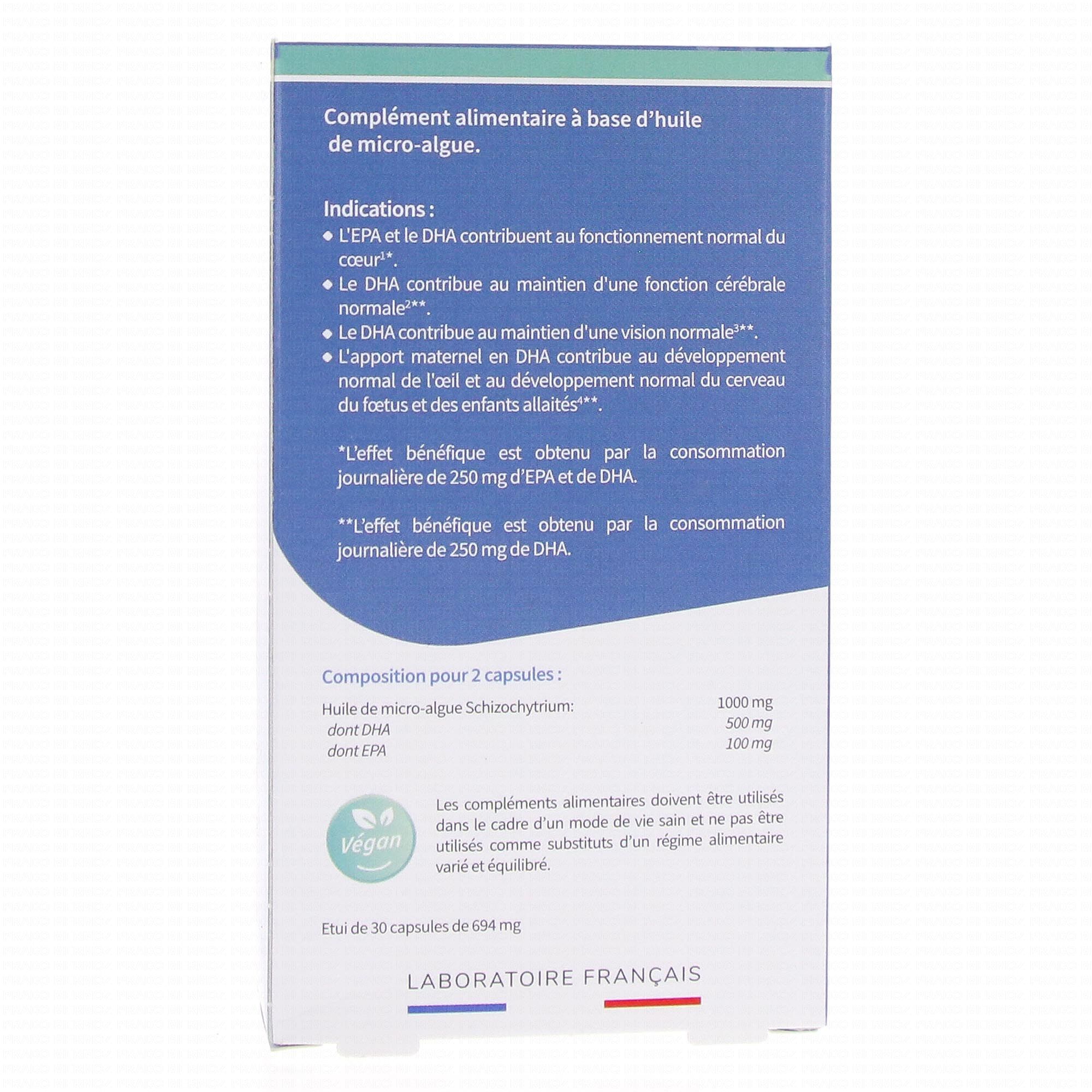 Analyse nutritionnelle par capsule: Huile extraite de la micro-algue Schizochytrium sp : 500 mg dont DHA (250 mg) et EPA (50 mg)