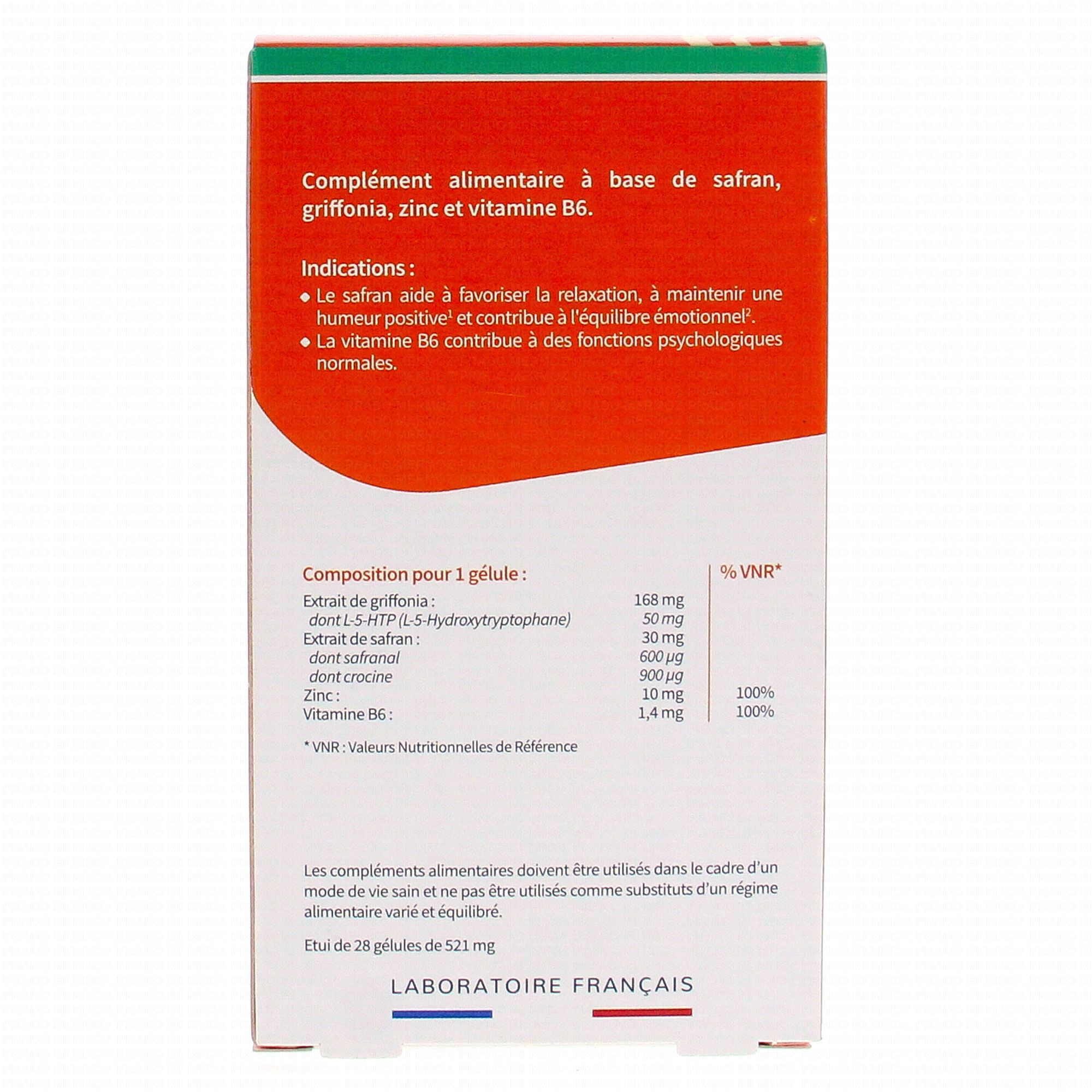 Pour 1 Gélules de Safralite 30 mg: agent de charge maltodextrine, extrait de griffonia simplicifolia 168 mg dont 5-HTP soit 50,40mg, tunique végétale HPMC, hydrolysat de protéines de riz et sulfate de Zinc soit Zinc (HYPRO-RI®): 10 mg (soit 100% des AJR*), extrait de stigmate de safran 30 mg dont safranal soit 600 µg, agent de charge silice, agent d'enrobage huile de palme, antiagglomérants stéarate de Mg et silice colloïdale anhydre, vitamine B6: 1,4 mg (Soit 100% des AJR*), excipients
