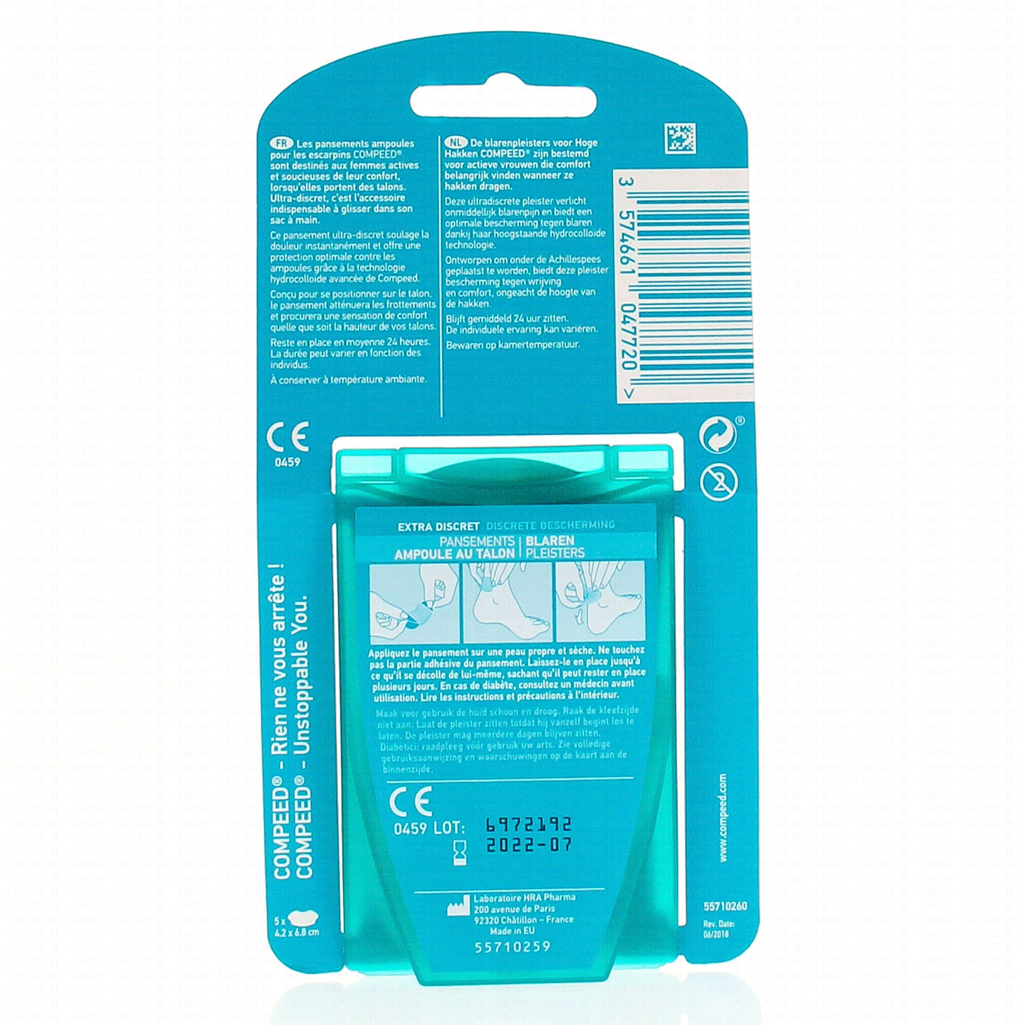 Spécialement conçu pour les ampoules se situant sur les talons des femmes coquettes, le Compeed ampoules talons pour femmes isole la plaie des différentes agressions extérieures : eau, bactérie, impureté. Ce pansement agit en protection et en traitement local tout en procurant un soulagement instantané. Discret et performant, ce pansement protège les talons fragiles des femmes actives toute la journée. Forme anatomique ovale, autoadhésif, absorbant, conformable, fin, hypoallergénique, perméable à la vapeur d'eau, imperméable à l'eau, imperméable aux bactéries. Soulage immédiatement la douleur, favorise la cicatrisation en hydratant la peau. Conditionnement : boîte plastique. Péremption : 3 ans.