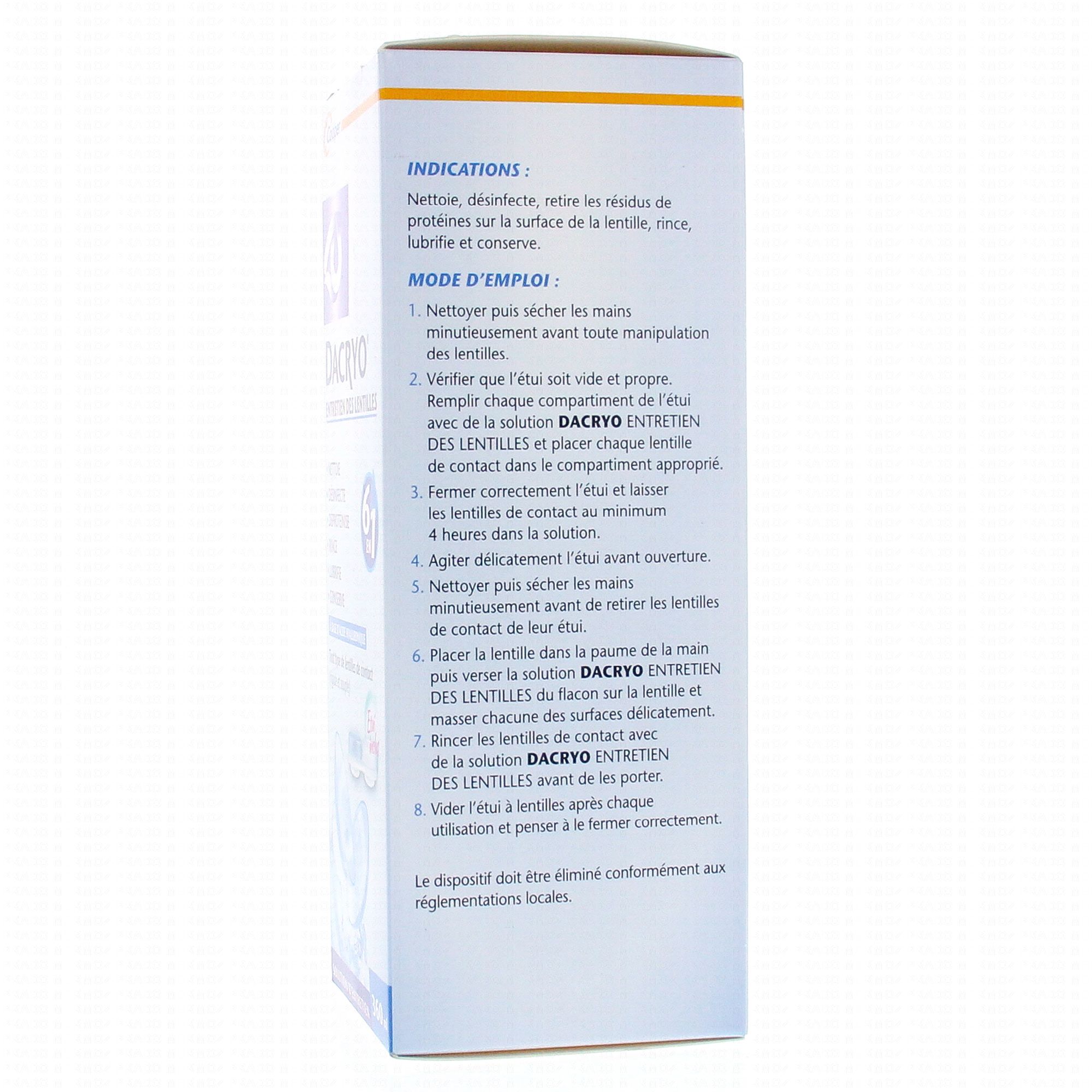 En stockLa solution d'entretien Dacryo nettoie, désinfecte, déprotéinise, rince, lubrifie et conserve l'état de vos lentilles. Elle améliore de le fonction lors de la pose de la lentille sur l'œil. Son action 6 en 1 fait de cette solution un produit particulièrement efficace et recommandé pour le traitement des lentilles de tous types (rigides ou souples). Formulé à base d'acide hyaluronique, molécule naturellement présente dans l'œil, elle garantit une utilisation confortable.