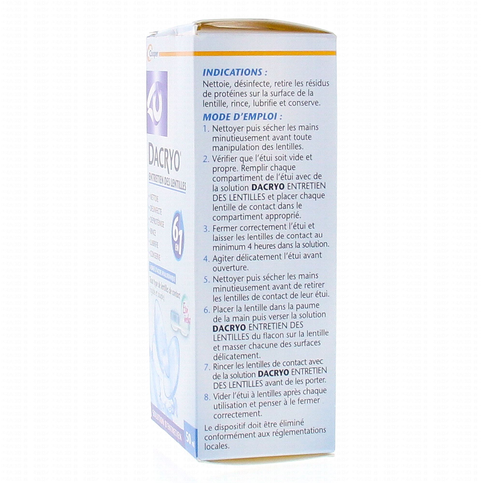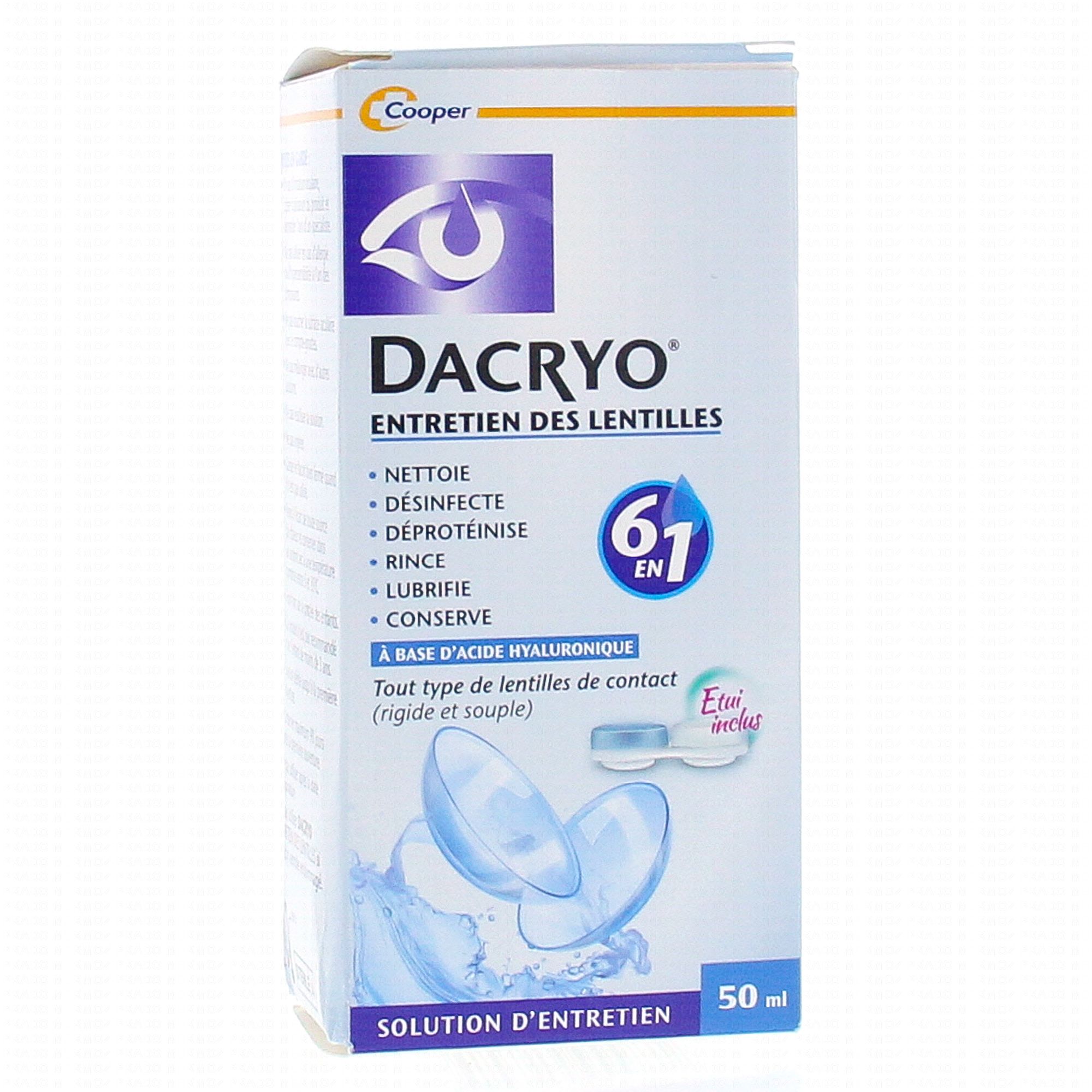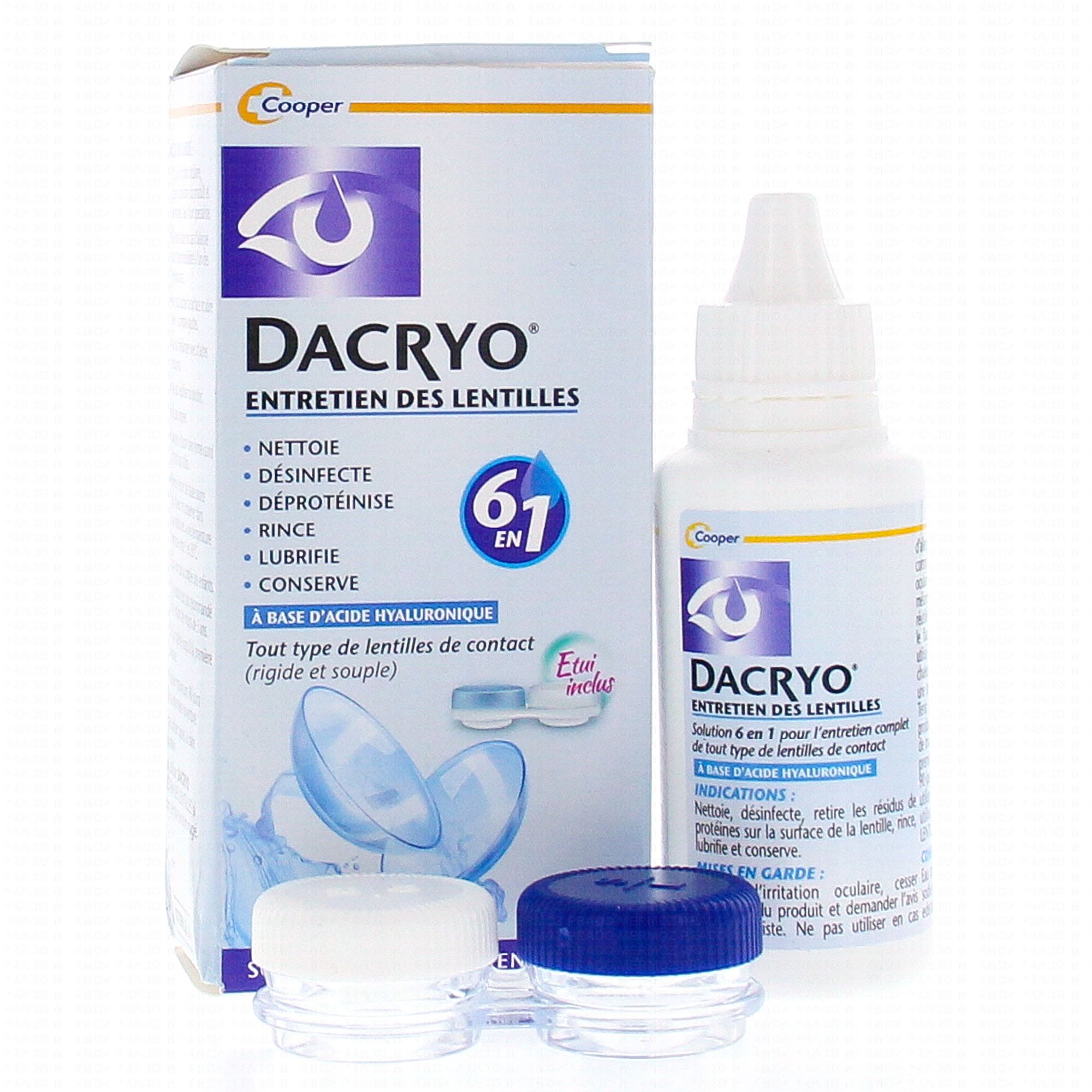 Momentanément indisponibleLa solution d'entretien Dacryo nettoie, désinfecte, déprotéinise, rince, lubrifie et conserve l'état de vos lentilles. Elle améliore de le fonction lors de la pose de la lentille sur l'œil. Son action 6 en 1 fait de cette solution un produit particulièrement efficace et recommandé pour le traitement des lentilles de tous types (rigides ou souples). Formulé à base d'acide hyaluronique, molécule naturellement présente dans l'œil, elle garantit une utilisation confortable.