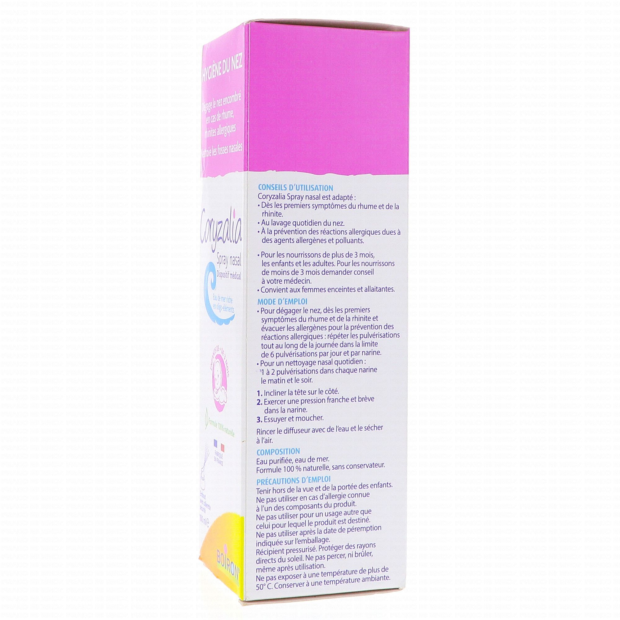 En stockCoryzalia Spray nasal du laboratoire Boiron est une solution nasale isotonique pressurisée à base d'eau purifiée et d'eau de mer riche en oligoéléments dont :