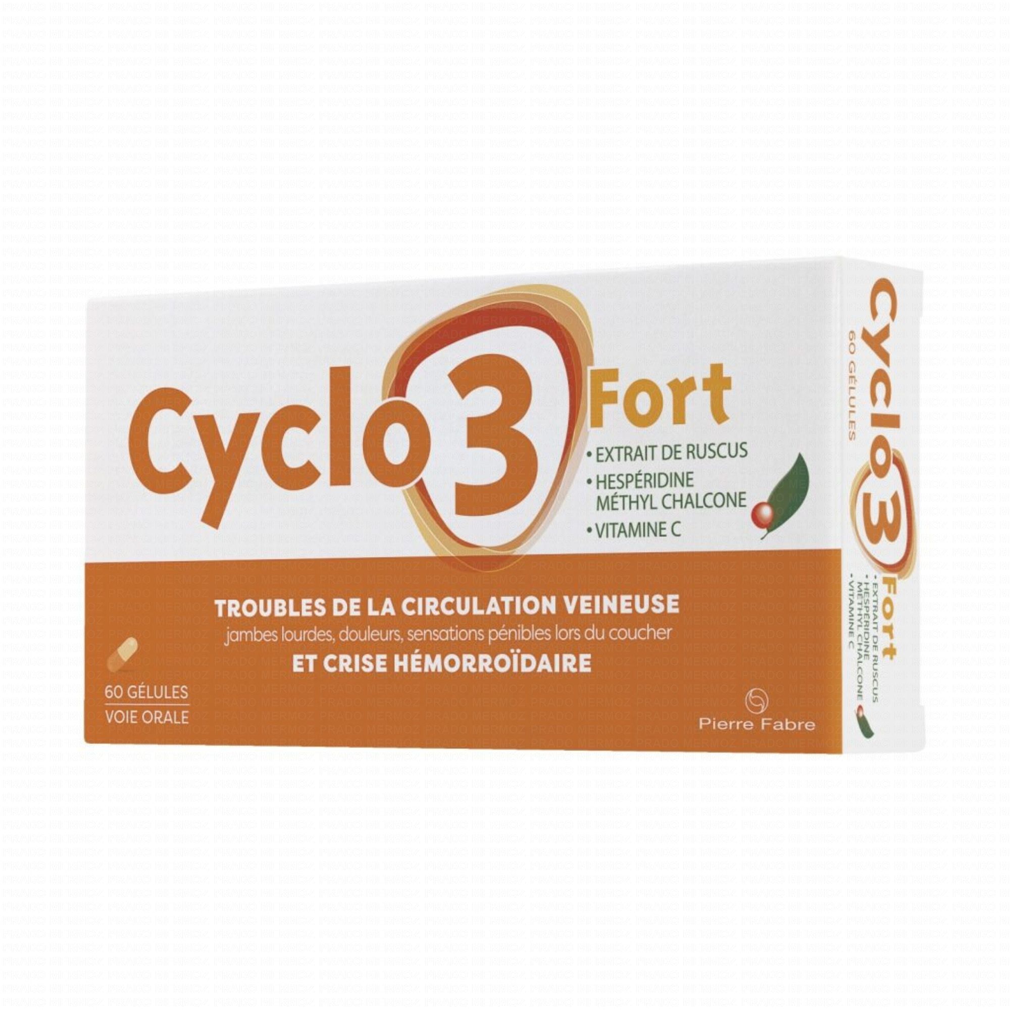CYCLO 3 FORT est une association de trois substances actives : extrait de ruscus, hespéridine méthyl chalcone et acide ascorbique (vitamine C). CYCLO 3 FORT appartient à un groupe de médicaments agissant sur la perméabilité des vaisseaux capillaires (système cardiovasculaire). Ce médicament est un veinotonique et un vasculoprotecteur (il augmente le tonus des veines et la résistance des vaisseaux et diminue leur perméabilité.)